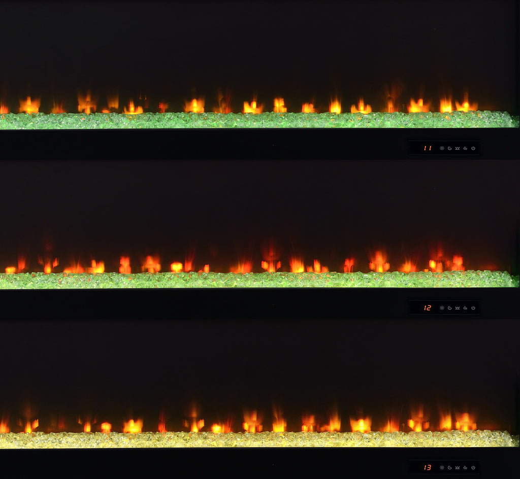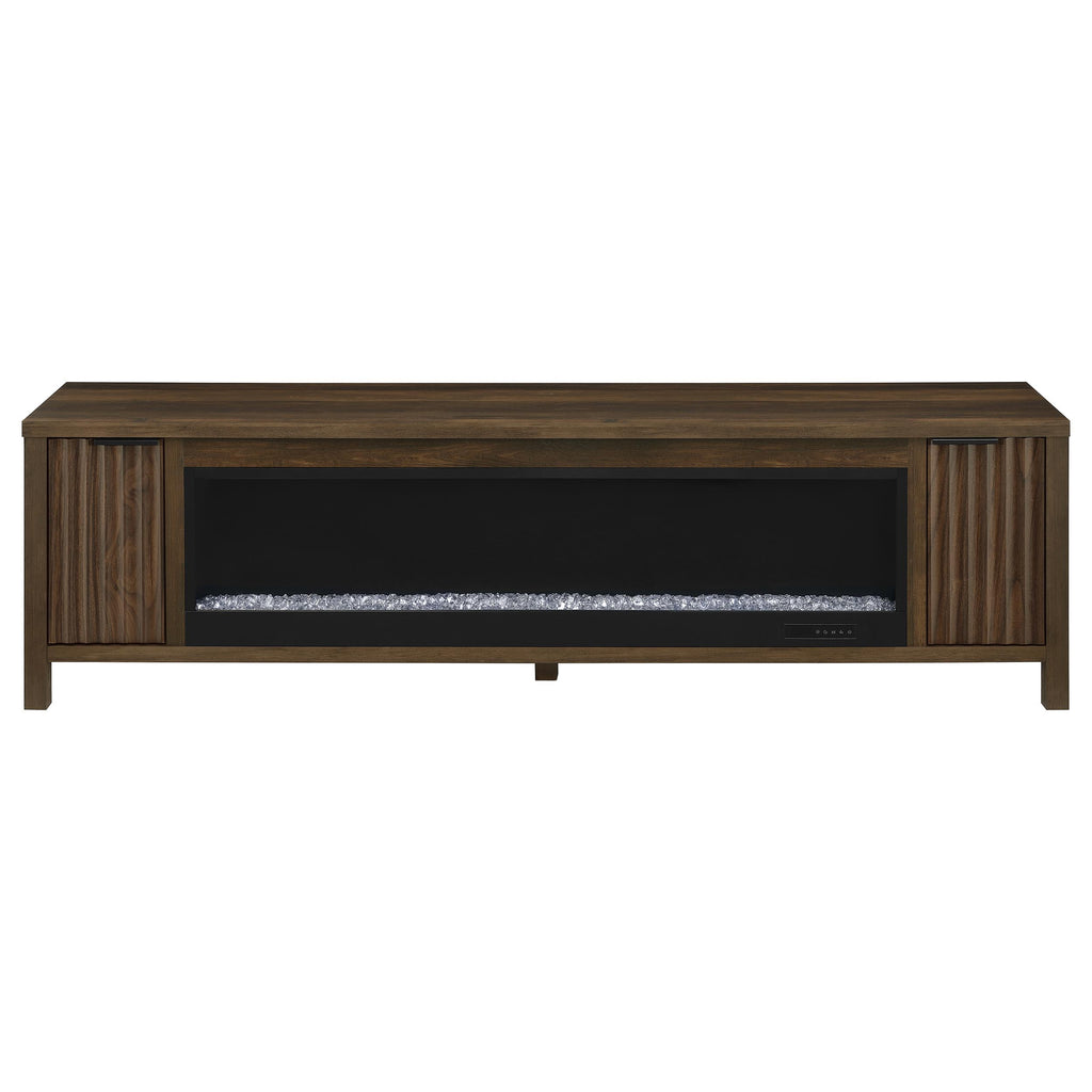 Flickering firelight glows behind glass, casting warmth and ambiance in perfect harmony. This media console fuses utility and romance, with slatted cabinet doors and an electric fireplace that offers visual charm without a heat function. Its dark pine finish anchors the space with rustic elegance, while generous surface and storage support your modern lifestyle. Whether used as a TV stand, media console, or hearth-inspired cabinet, it invites connection in every season. Key Features: • TV stand with electric flame visualizer insert adds warmth and function to any living room space • Dark pine finish enhances the rustic look with rich wood-inspired character • Slatted side doors open to reveal adjustable shelves for concealed media storage • Fireplace without heat function and features 15 flame color options for ambiance • Crafted from engineered wood, honeycomb board, clear glass, and laminate veneer • Black hardware accents offer contrast and modern styling to the wood-look cabinet