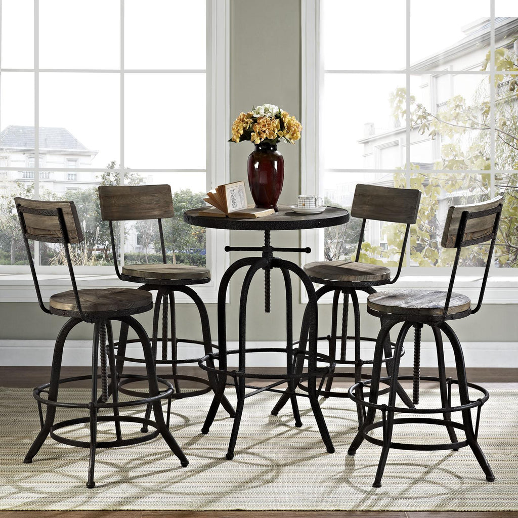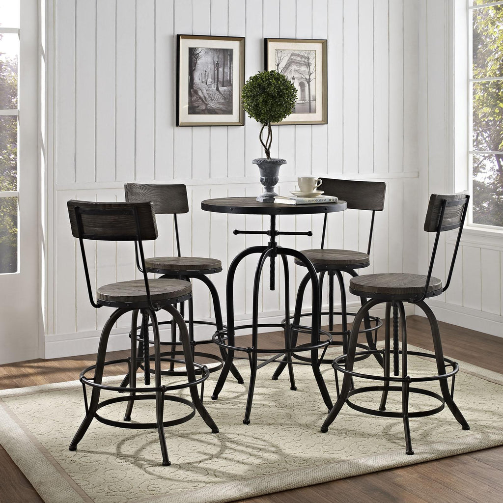 Capture the authenticity of industrial modern with the richly grained solid pine wood and cast iron frame Gather bar table and stool set. Enthusiasm spans the ages with a set that secures the rustic aestheticism of the past with a calming version of the present. Cabin and factory elements combine in this bar set fashioned with stylish tapered legs and foot rings for added support. Set Includes: Four - Collect Wood Top Counter Stool One - Sylvan Wood Top Bar Table Industrial modern bar set Bar table with four bar stools Pinewood is stained not sealed. Actual wood color may vary. Chair Weight Capacity - 330 lbs. Cast iron frame Tapered metal legs Foot rings Overall Product Dimensions: 23.5"L x 117.5"W x 30 - 39.5"H Overall Bar Table Dimensions: 23.5"L x 23.5"W x 30 - 39.5"H Overall Bar Stool Dimensions: 23.5"L x 23.5"W x 22 - 33"H Bar Stool Seat Dimensions: 13.5"L x 13.5"W x 20.5"H