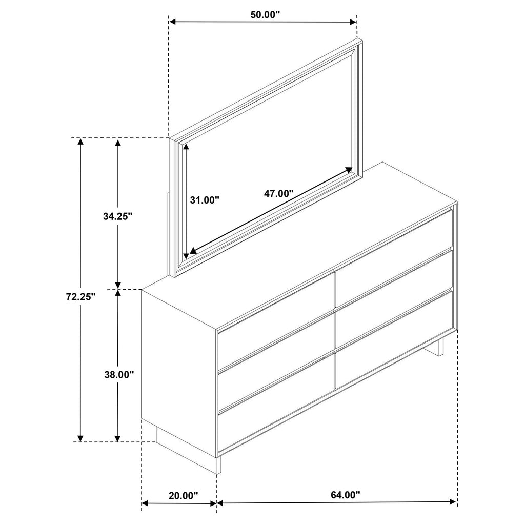 A modern six-drawer dresser includes a framed mirror for a complete look and feel in your bedroom. The dresser offers ample storage with roomy drawers, the top two of which include dark brown felt lining for added protection for delicate items. The wooden design features a warm brown wood grain finish, perfect for streamlined simplicity in your bedroom. Drawer fronts are surrounded with mitered trim and fingertip pulls for a smooth, refined presentation. The dresser is topped with a framed mirror that includes matching mitered trim and beveled glass for easy reflectivity. Key Features: • Clean, straightforward design details bring stylish flair to a modern six-drawer dresser and mirror • A warm brown wood finish complements rubberwood veneer and wood construction for a handsome look • Fingertip pulls create a smooth, flat drawer front design, adding to a streamlined look and feel • Top drawers include felt lining in a dark brown color, adding protection for delicate items • Drawers feature English dovetail joinery and metal glides for excellent performance
