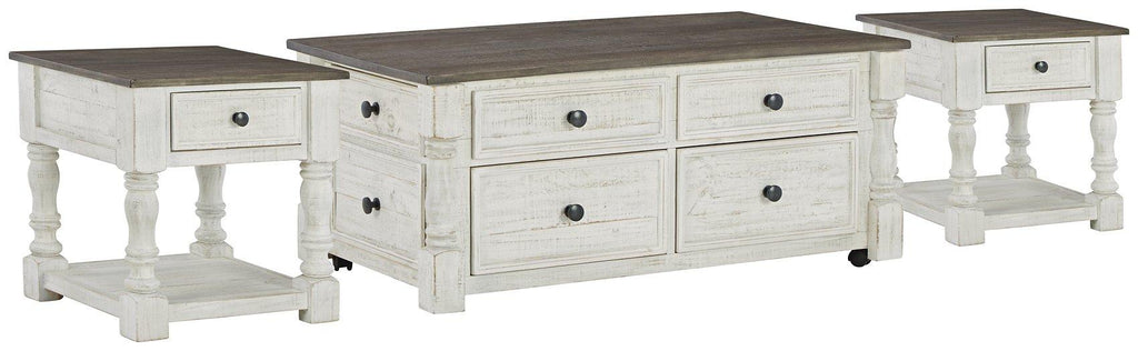 With its richly rustic finish and textural mix, this occasional table set goes to town on modern farmhouse style. Distressed two-tone treatment blends a weathered gray with vintage white for an utterly charming effect. Robust legs lend a hearty, substantial look that feels right at home.