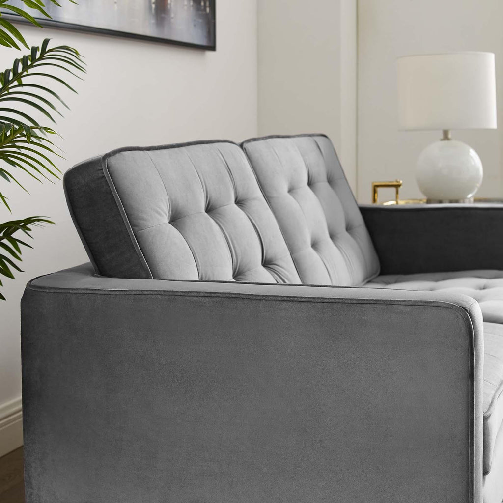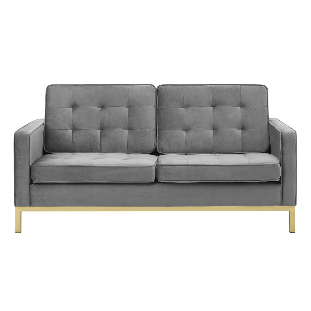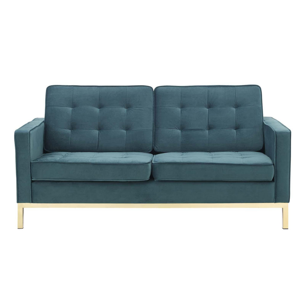 Revolutionize your living room furniture with the iconic Loft Button Tufted Performance Velvet Loveseat. Adding visual depth to your living room or lounge space, Loft features soft and durable performance velvet upholstery accented in elegant button tufting. This retro modern living room loveseat comes in a captivating linear design with an external tubular stainless steel frame, four gold stainless steel legs, and non-marking foot caps. Inspired by the richness of mid-century modern style, Loft is the preferred choice of living rooms and lounge spaces. Loveseat Weight Capacity: 600 lbs.