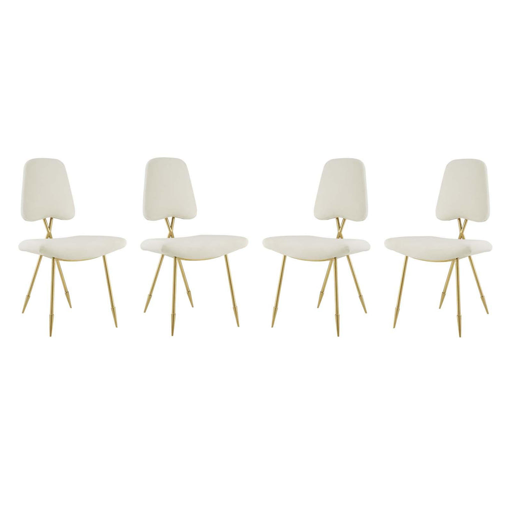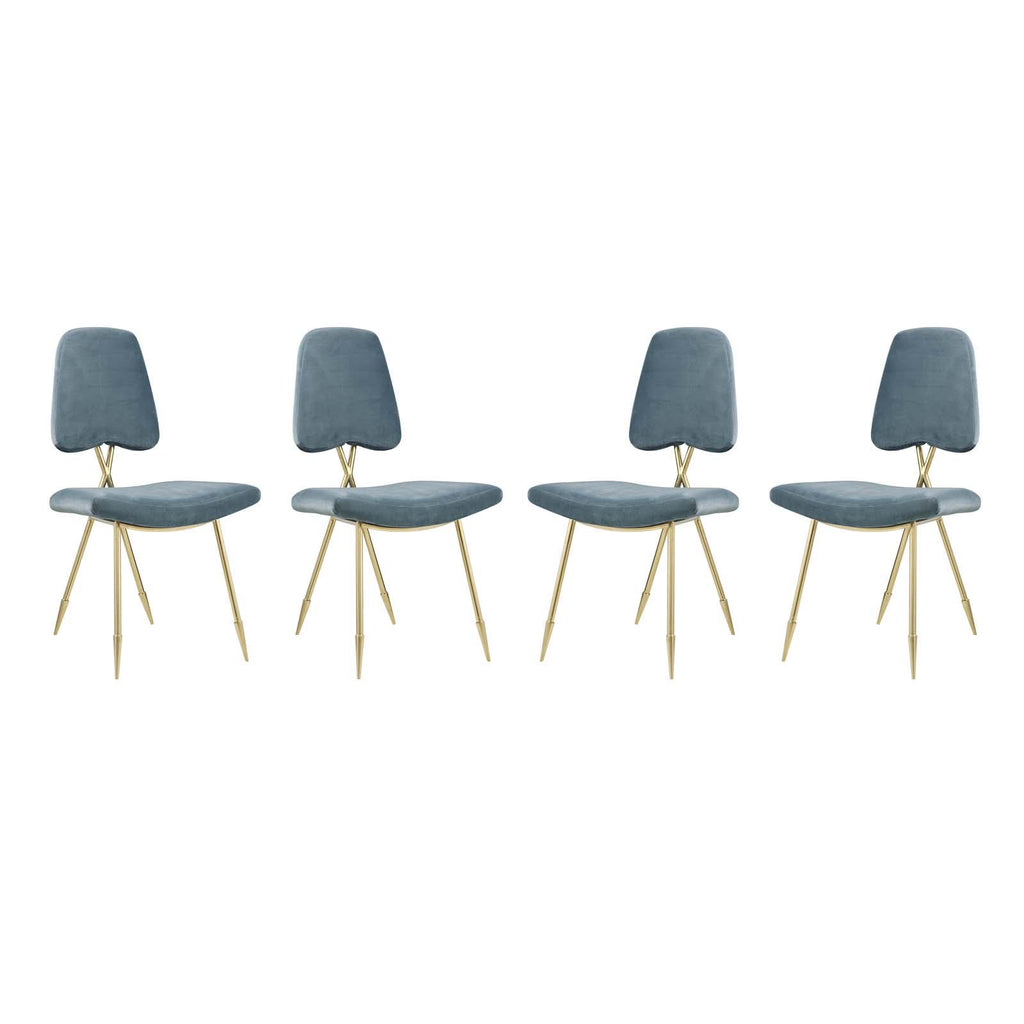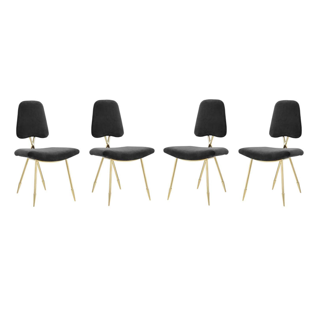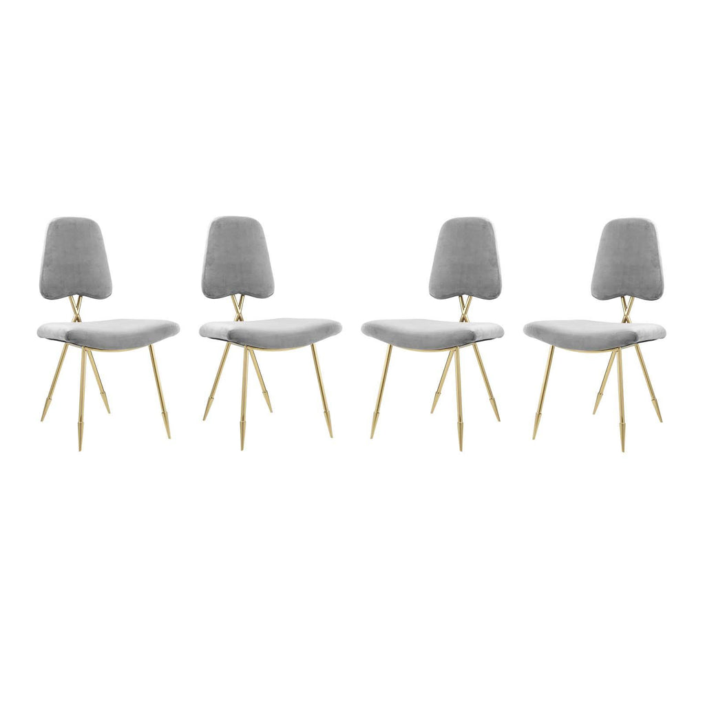 Survey your surroundings with confidence with the Ponder Dining Side Chair. Ponder�s padded high-density foam seat gently slopes upward providing embracing comfort while the tapered back provides ergonomic support. Finely upholstered in luxuriously soft velvet, and supported by a sturdy gold stainless steel frame with four angled mid-century toothpick legs, Ponder makes a striking statement. Accentuate your modern decor with a contemporary side chair that elevates any empty area of your home.