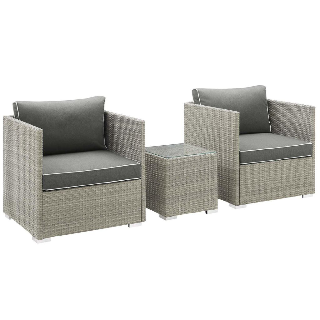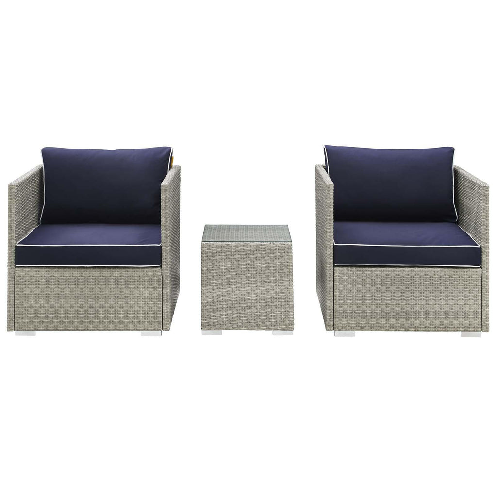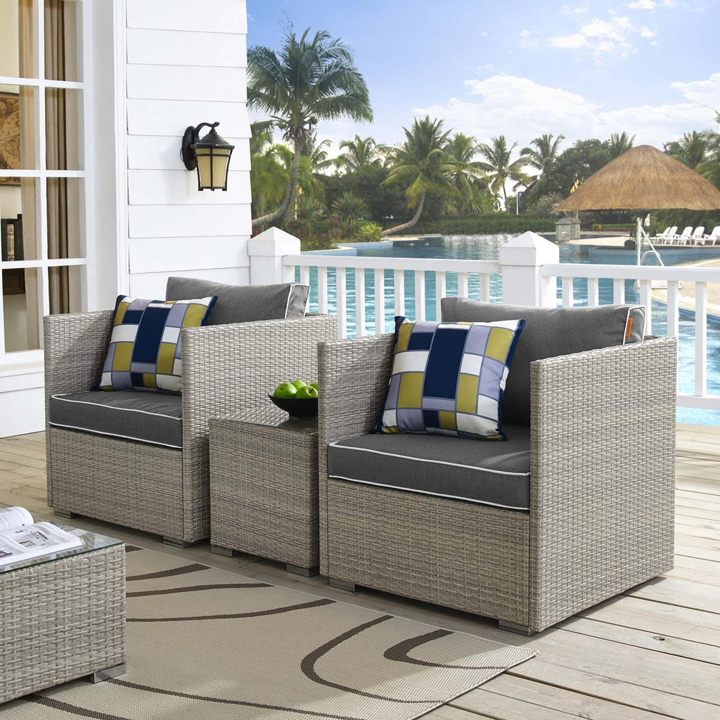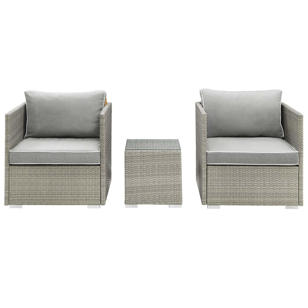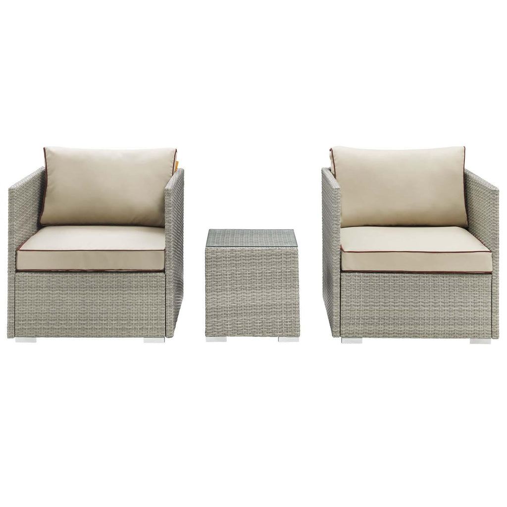 Enjoy the outdoors while benefiting from style and comfort. Repose offers a detailed tan and gray synthetic rattan weave with UV protection for eye-catching appeal and durability, plush 4� thick all-weather polyester cushions with contrasting color French piping, non-marking foot pads, and sturdy powder-coated aluminum framed seats and ottomans that support up to 331 pounds each. Subtle style defines the Repose outdoor sectional collection making it a natural choice for enhancing your patio, backyard, or poolside gatherings.