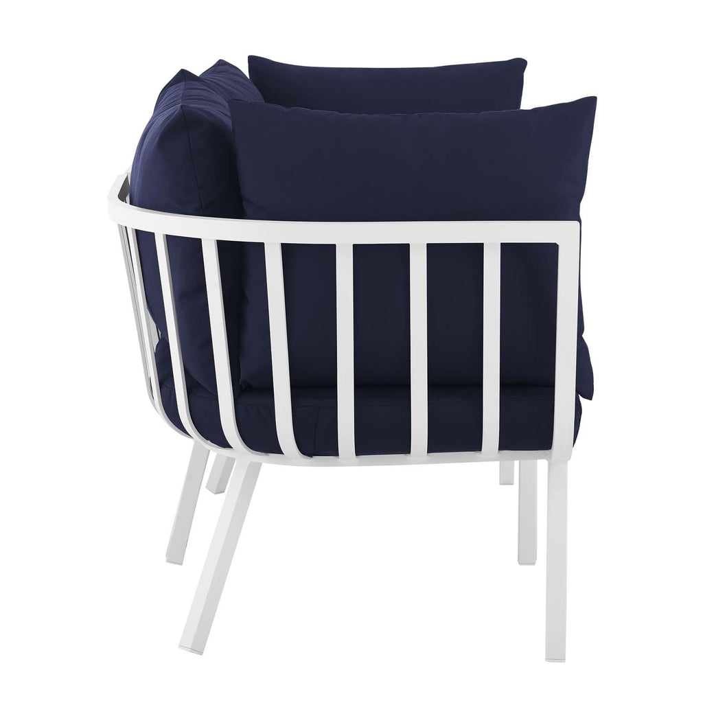 Refresh your outdoor decor with the Riverside Outdoor Patio Aluminum Loveseat. Defined by a crisp, coastal style, this installment of the Riverside outdoor sectional sofa furniture collection features an open slatted back design, angled back legs, and plush 4" thick all-weather UV-resistant fabric cushions. Solidly constructed with a powder-coated aluminum frame, the Riverside outdoor loveseat will enhance the look of your patio, backyard, balcony, porch, deck, or poolside area. Includes foot caps. Seat Weight Capacity: 300 lbs Set Includes: Two - Riverside Corner Chair Outdoor Patio Loveseat Powder-Coated Aluminum Frame All-Weather Fabric Cushions Plush 4" Thick Cushions Seat Weight Capacity 300 lbs Comes Fully Assembled Patio Sectional Sofa Series Overall Product Dimensions: 29.5"L x 59"W x 28"H Individual Corner Chair Dimensions: 29.5"L x 29.5"W x 28"H Seat Dimensions: 26.5"L x 26.5"W x 17"H Backrest Height: 11"H Armrest Height: 11"H Cushion Thickness: 4"H