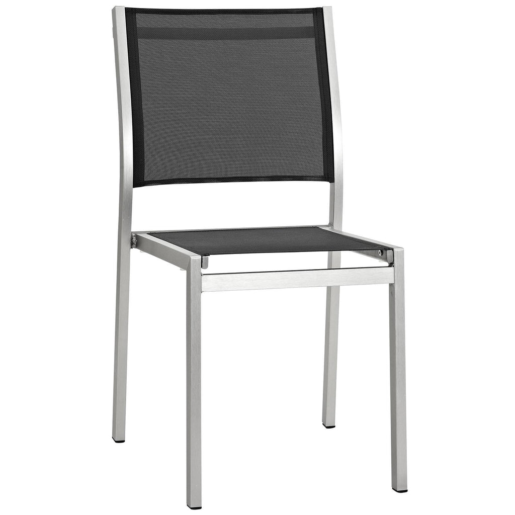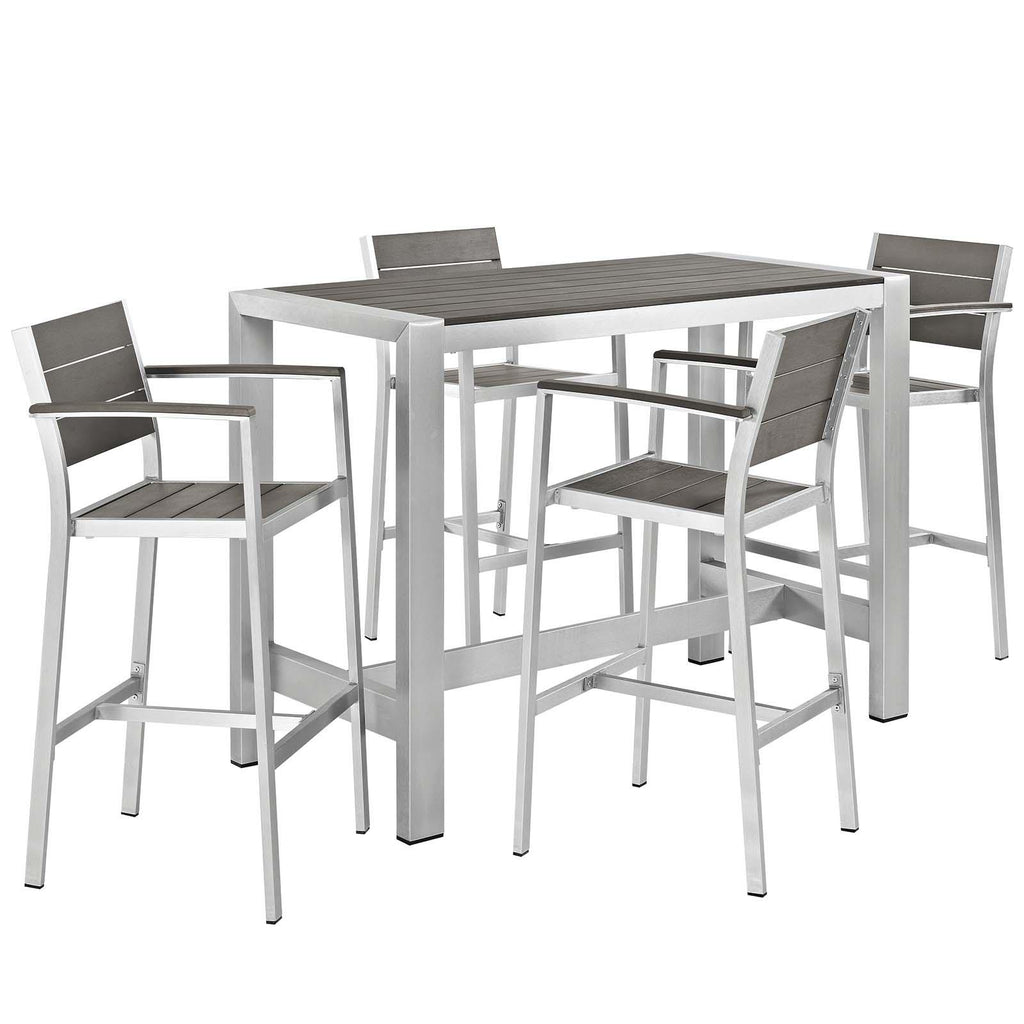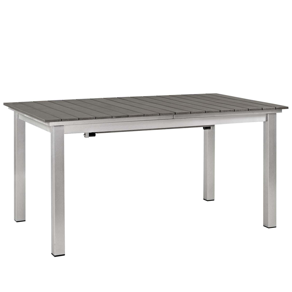 Enjoy your patio or backyard leisure time with the strong and durable Shore Outdoor Patio Dining Furniture Set. Made with an anodized brushed aluminum frame and non-marking black plastic foot caps, Shore Outdoor Dining set features tone-on-tone grays with wood accents on the paneling for a chic and minimalist look. The Shore Patio Dining collection complements your casual gatherings with a look and functionality that you can rely on.