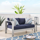 Enjoy your patio or backyard leisure time with the strong and durable Shore Outdoor Aluminum Lovesesat. Made with an anodized brushed aluminum frame and non-marking black plastic foot caps, Shore comes outfitted with resilient Sunbrella� fabric canvas cushions tested to last through all weather conditions. The Shore Outdoor Aluminum Loveseat complements your casual gatherings with a look and functionality you can rely on.
