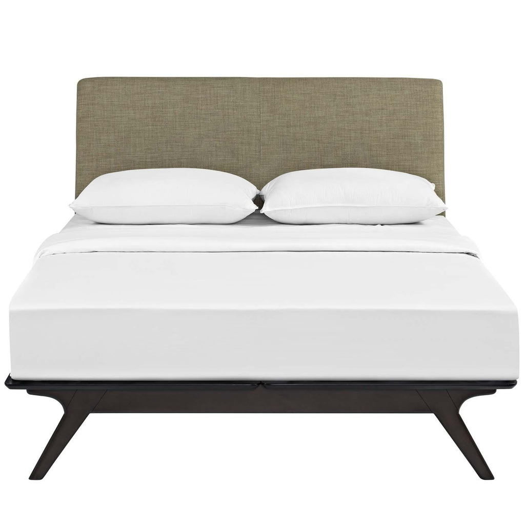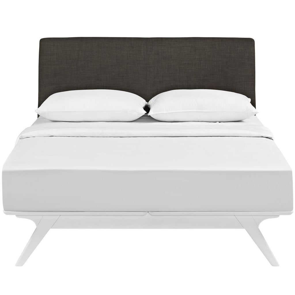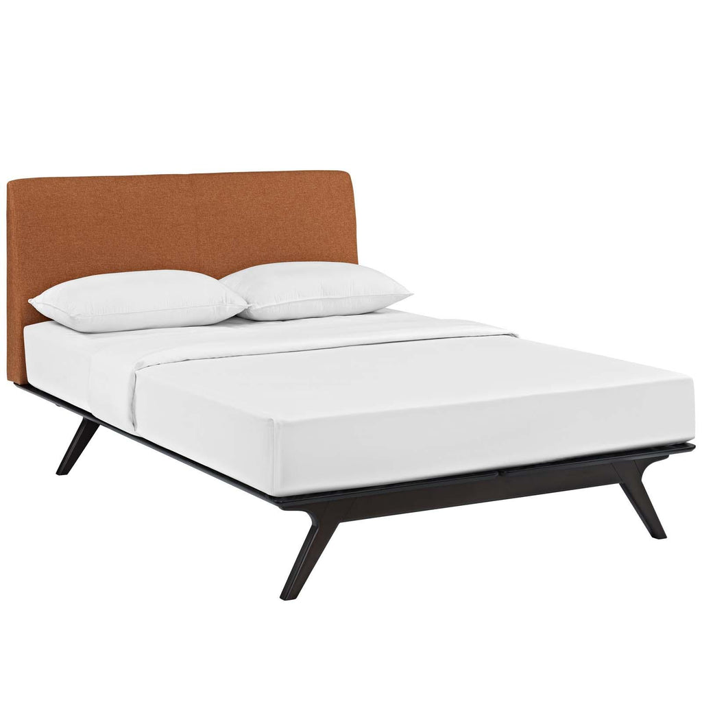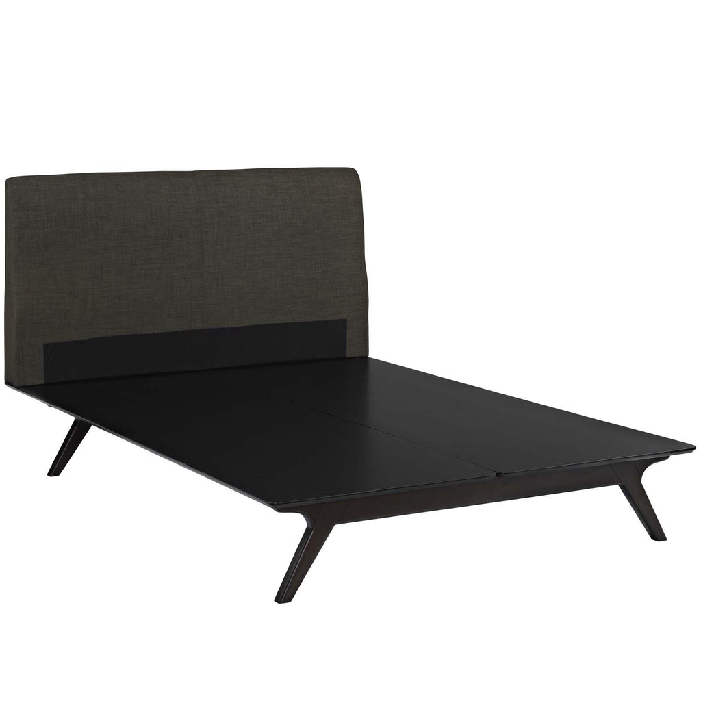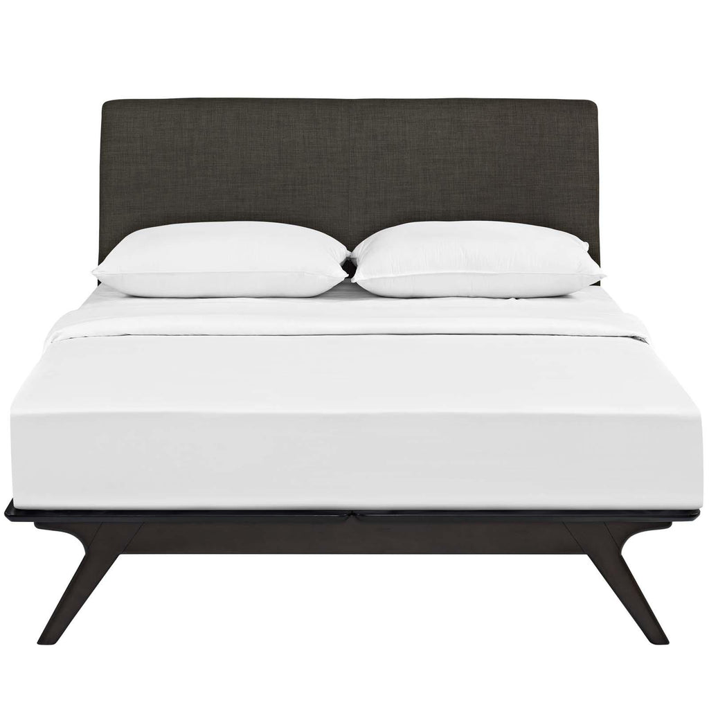 Transform your ordinary bedroom arrangements into a more compelling decor with the Tracy queen size platform bed. Made of sturdy MDF boards, Tracy with its open design and platform leg support, proves that elegance doesn�t need to come at the expense of simplicity. Finely upholstered with a foam padded fabric headboard, Tracy is an easy to maintain toffee brown stained piece that admirably delivers both comfort and style. Tracy requires assembly, and should be spot cleaned only. Headboard included. Queen size mattress not included. The Tracy queen size platform bed does not need a boxspring.