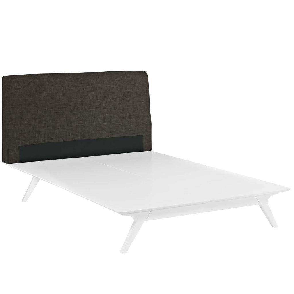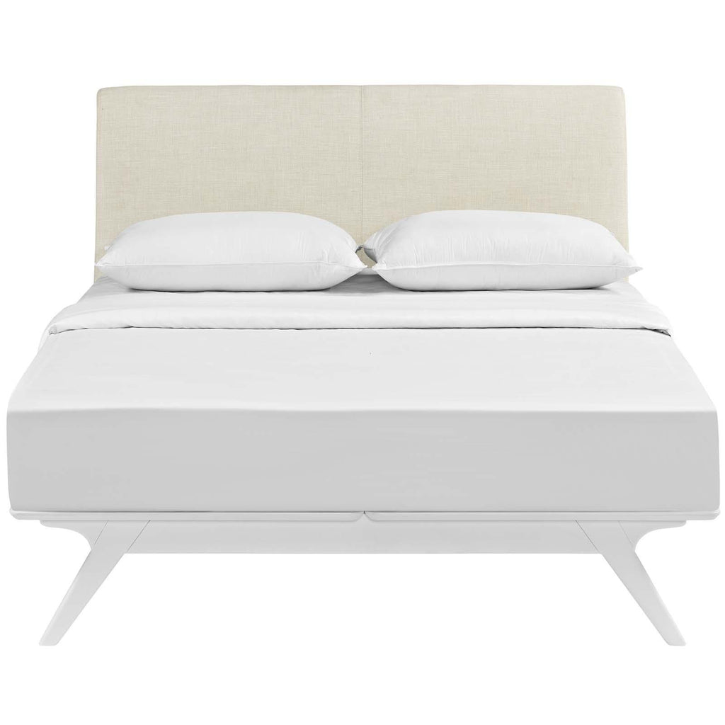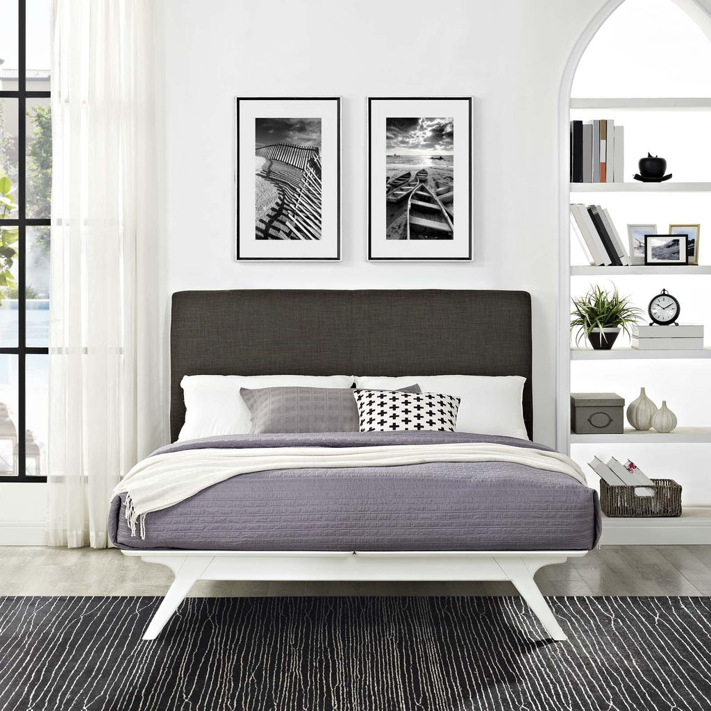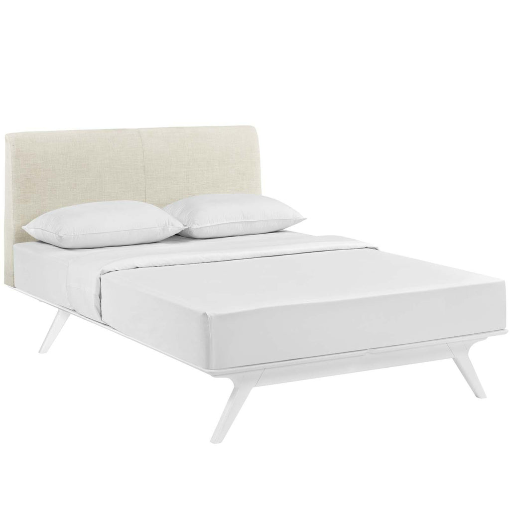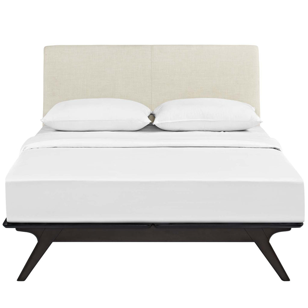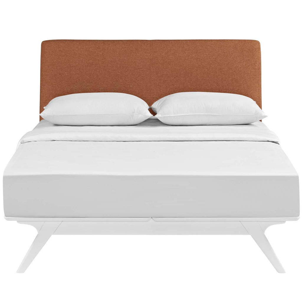 Transform your ordinary bedroom arrangements into a more compelling decor with the Tracy queen size platform bed. Made of sturdy MDF boards, Tracy with its open design and platform leg support, proves that elegance doesn�t need to come at the expense of simplicity. Finely upholstered with a foam padded fabric headboard, Tracy is an easy to maintain toffee brown stained piece that admirably delivers both comfort and style. Tracy requires assembly, and should be spot cleaned only. Headboard included. Queen size mattress not included. The Tracy queen size platform bed does not need a boxspring.