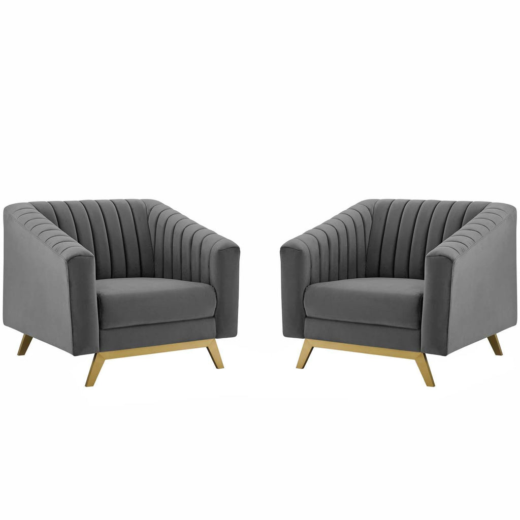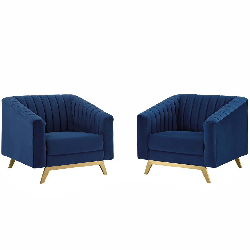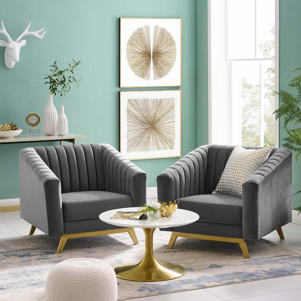 Harness the visual appeal of linear elements with the Valiant Performance Velvet Armchair Set of 2. Interior vertical channel tufting creates a directed flow that adds depth to your retro modern living room, entryway, lounge room, or home office. Each subtle retro modern accent swirls together for an organically designed piece that provides both decor appeal and premium comfort. Soft, stain-resistant performance velvet upholstery covers an individually-wrapped pocket coil support system encased in dense foam padding for a luxurious seating experience. The Valiant upholstered velvet armchair rests securely on four splayed and tapered gold stainless steel legs with non-marking foot caps and can support up to 300 lbs.
