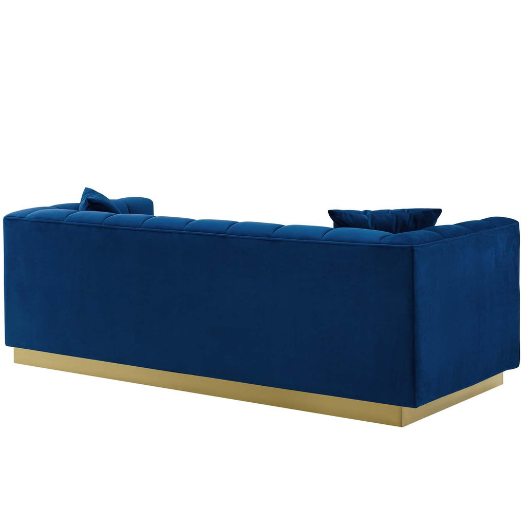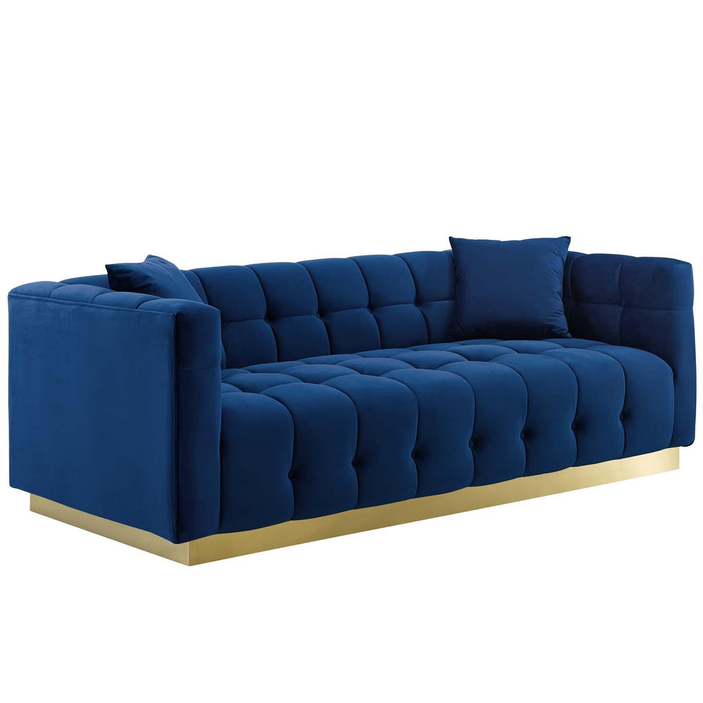 Harmony and sophistication flow together with the Vivacious Sofa. Deep button tufting combines with a tailored profile to create a captivating vintage look. A glamorous focal point to any living room or lounge room, Vivacious grants a luxurious embrace with soft, stain-resistant performance velvet upholstery covering the dense foam padding and individually wrapped spring coil system. Featuring a gold stainless steel base, Vivacious is an elegant piece that is supremely comfortable and supportive. This chic sofa comes complete with two accent pillows that perfectly complement Vivacious's rich hue. Maximum Weight Capacity: 900 lbs. Comes Fully Assembled.