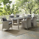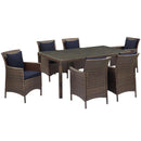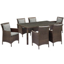 Refresh your alfresco space with the Conduit 7 Piece Outdoor Patio Dining Set. Bringing transitional style with contemporary modern flair to any outdoor area, Conduit Armchairs feature a powder-coated aluminum frame wrapped in synthetic UV-resistant wicker rattan. Foam padded cushion and waterproof cover offer a comfortable seat while dining or entertaining. The Conduit 70" Dining Table features a tempered glass tabletop provides a smooth, easy-to-clean surface ideal for dining and entertaining. All-weather and long lasting, this versatile outdoor dining set creates a serene setting for your morning tea, sunny lunch, sunset meal, and everything in between.
