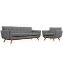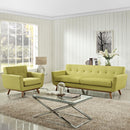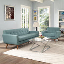 Gently sloping curves and large dual cushions create a favorite lounging spot. Whether plopping down after a long day at work, settling in with coffee and brunch, or entering a spirited discussion with friends, the Engage sofa is a welcome presence in your home. Seven tufted buttons create eye-catching appeal, adding depth that brings your sitting d�cor to center stage. Four cherry color rubberwood legs and frame supply a solid base to the comfortable upholstered material.