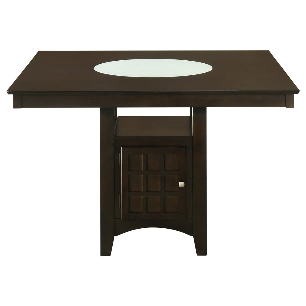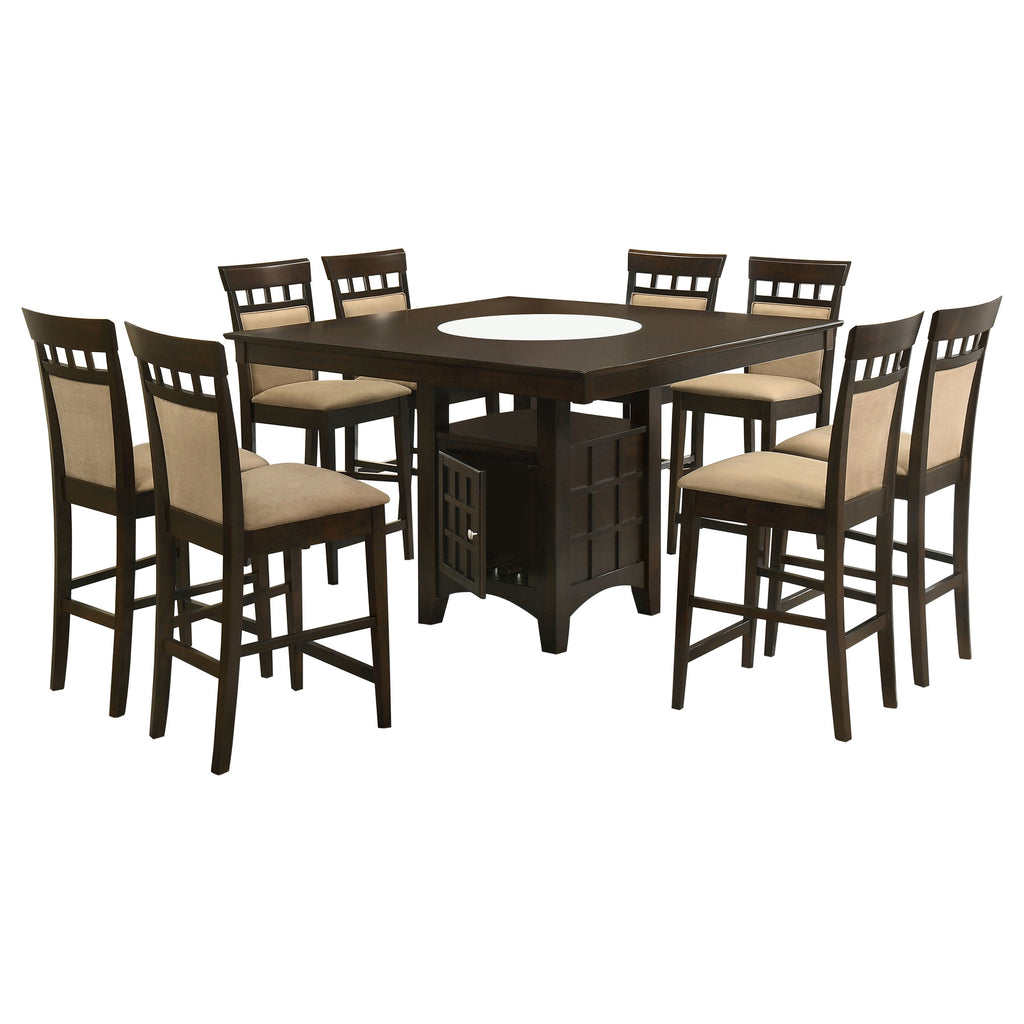 Appreciate the texture and dimension created with gris lattice details in a charming five-piece transitional counter height dining set. A rich cappuccino finish pairs with soft tan upholstery to create a neutral palette, perfect for creating a warm and welcoming ambiance in your kitchen or dining room. The set centers on a square dining table that includes a lower shelf and cabinet, offering multifunctional appeal that maximizes space utilization. The cabinet includes stemware and bottle storage to keep favorite vintages at your fingertips while enjoying delicious meals with friends and family. Chairs includes full backs and footrests for excellent support and comfort, while the open cube design lightens the overall look while ensuring rich dimensionality. Key Features: • Charming five-piece transitional counter height dining set with gris lattice details • Rich cappuccino finish pairs with soft tan upholstery to create a neutral palette • Square dining table includes a lower shelf and cabinet for multifunctional appeal and space utilization • Cabinet includes stemware and bottle storage for favorite vintages • Chairs feature full backs and footrests for excellent support and comfort