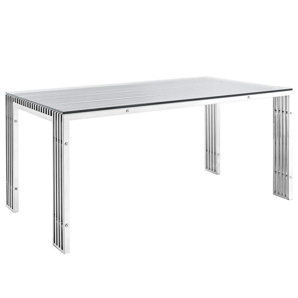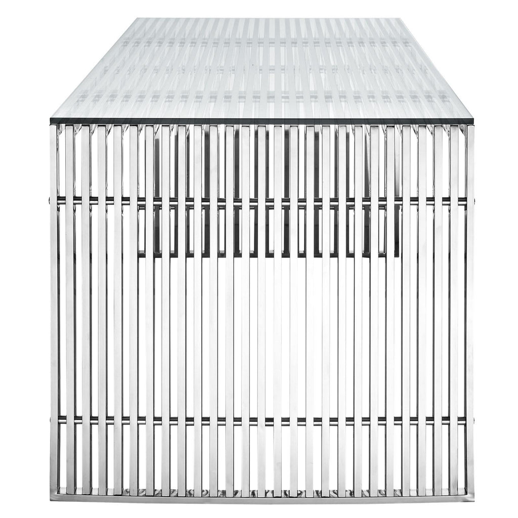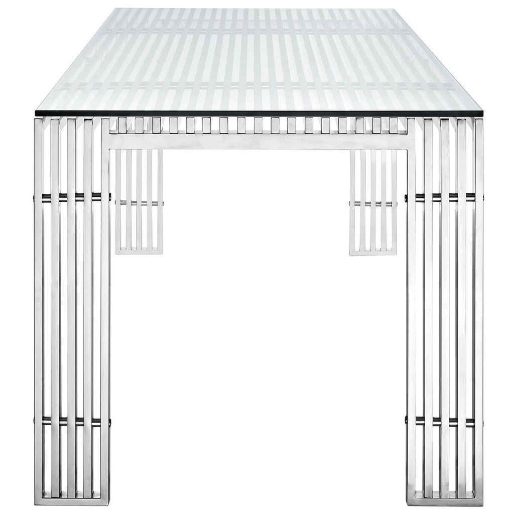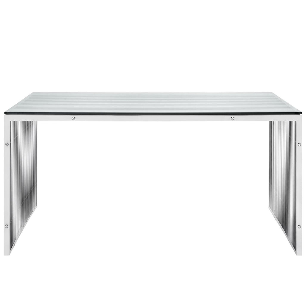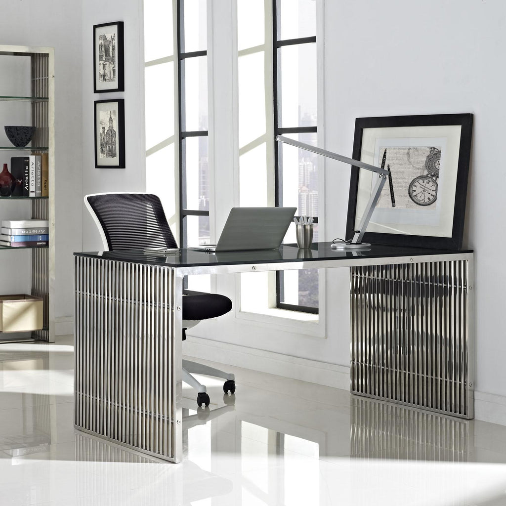 The conduit design of this Gridiron series installment artfully blends stainless steel tubing with a tempered glass tabletop. Modernism used to be about extremes. Wild shapes and patterns that don�t dare resemble its predecessors. We�ve reached an age of maturity of sorts. We appreciate style, but all the more, we respect those designs that represent a blending of cultures. The Gridiron stainless steel office desk is famous not for its radical shape, but for the strategic transcendence that it provides.