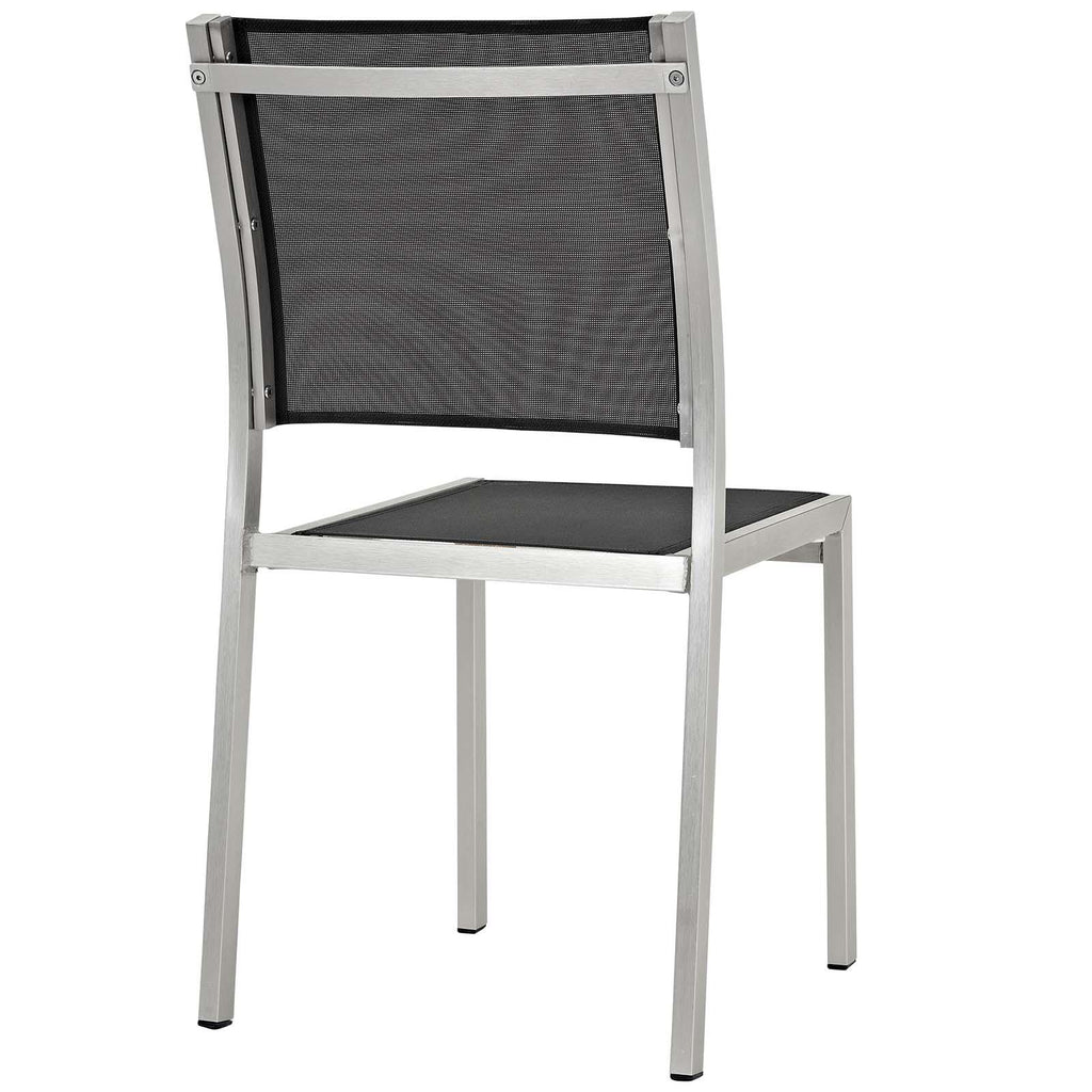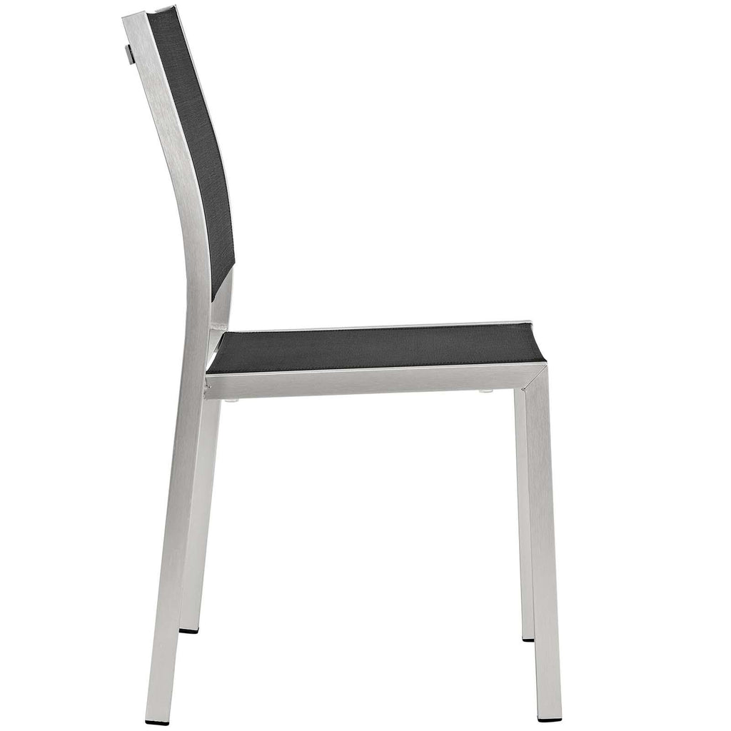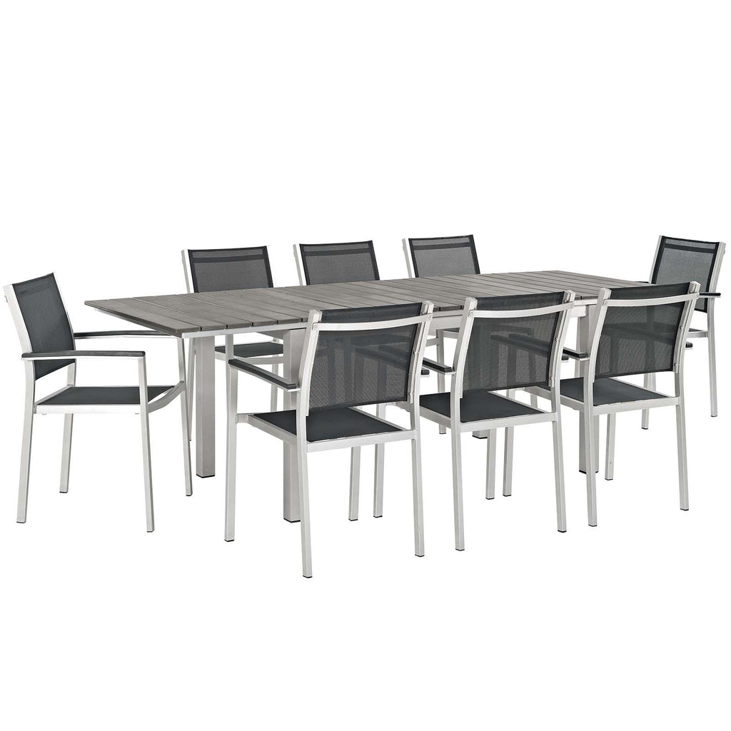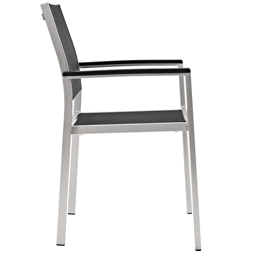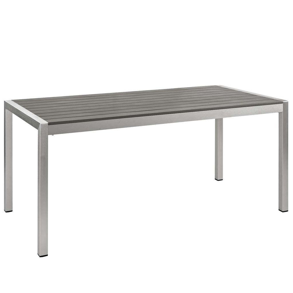 Enjoy your patio or backyard leisure time with the strong and durable Shore Outdoor Patio Dining Furniture Set. Made with an anodized brushed aluminum frame and non-marking black plastic foot caps, Shore Outdoor Dining set features tone-on-tone grays with wood accents on the paneling for a chic and minimalist look. The Shore Patio Dining collection complements your casual gatherings with a look and functionality that you can rely on.