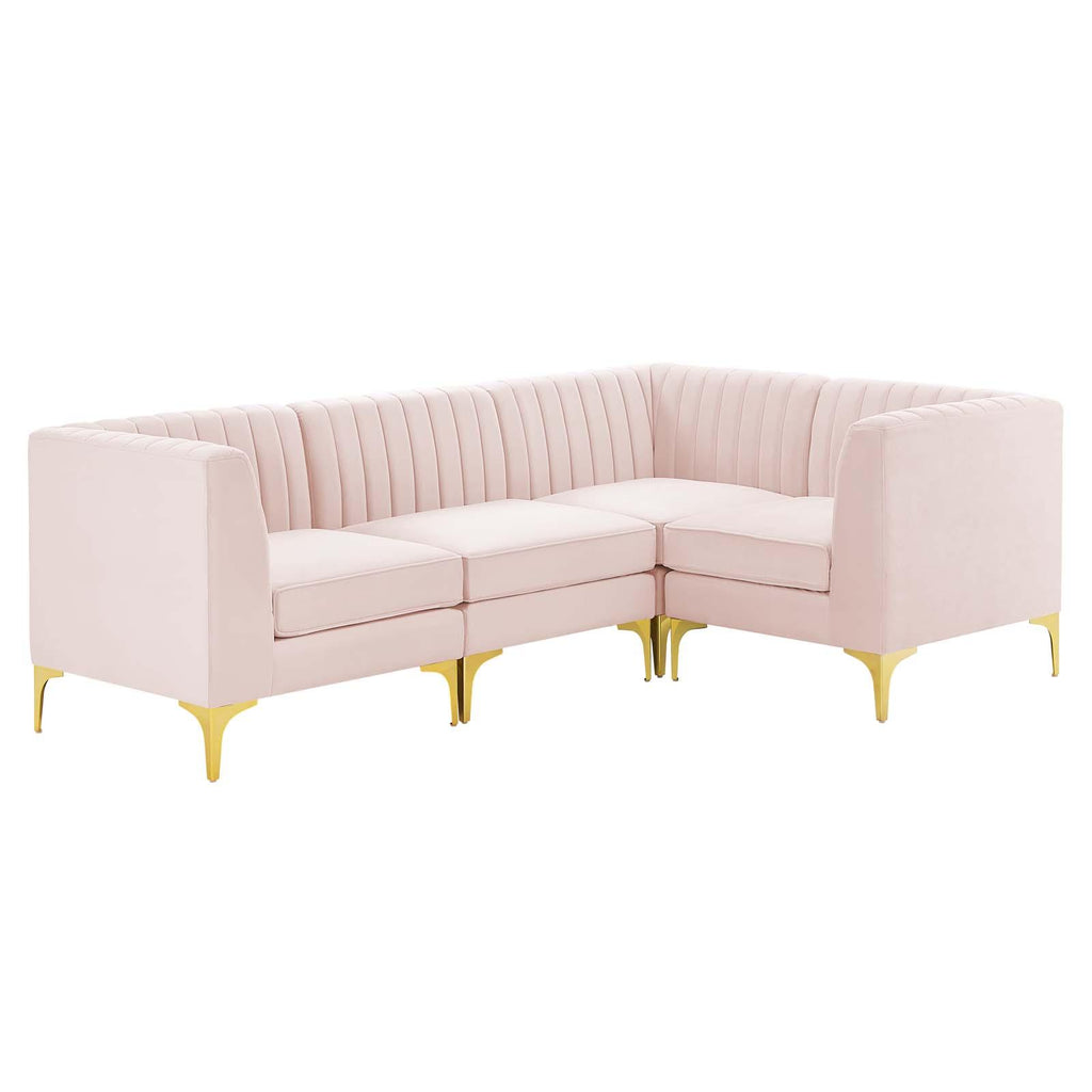 Elevate your living space with the visual appeal and linear detail of the Triumph Channel Tufted Performance Velvet 4-Piece Sectional Sofa. With interior channel tufting and luxe velvety texture, this sectional sofa abounds in retro modern style and glam deco charm. This couch is part of a sectional sofa collection that allows you to create a seating solution that works for your living room, bedroom, office space, entryway, or lounge area. This upholstered sectional sofa is covered in stain-resistant performance velvet and features dense foam padding and a sinuous spring support system for a premium seating experience. The velvet sofa sits on four gold metal legs with non-marking foot caps to protect your flooring. Weight Capacity for Each Sectional Sofa Piece: 440 lbs.