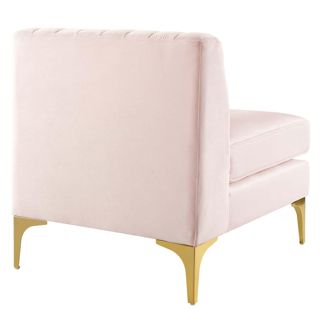 Elevate your living space with the visual appeal and linear detail of the Triumph Channel Tufted Performance Velvet Sofa. With interior channel tufting and luxe velvety texture, this sofa abounds in retro modern style and glam deco charm. This couch is part of a sectional sofa collection that allows you to create a seating solution that works for your living room, bedroom, office space, entryway, or lounge area. This upholstered sectional sofa is covered in stain-resistant performance velvet and features dense foam padding and a sinuous spring support system for a premium seating experience. The velvet sofa sits on gold metal legs with non-marking foot caps to protect your flooring. Weight Capacity for Each Sectional Sofa Piece: 440 lbs.