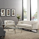Sale the tide of elegance with Coast. Buoyed with exquisite deep button tufting and fine trim, Coast comes upholstered in polyester with a walnut stained wood leg base with non-marking foot glides. Solidly made with exceptional support, Coast features dense foam cushioning, removable seat covers for easy cleaning and generous seating space. Combining mid-century style with ageless nobility, the Coast Living Room Set is perfect for modern and eclectic living rooms, lounge spaces, and reception areas.