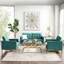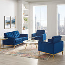 Revolutionize your living room furniture with the iconic Loft Gold Stainless Steel Leg Performance Velvet Loveseat and 2 Armchair Set. Adding visual depth to your living room or lounge space, Loft features soft and durable performance velvet upholstery accented in elegant button tufting. This retro modern living room set comes in a captivating linear design with an external tubular stainless steel frame, four gold stainless steel legs, and non-marking foot caps. Inspired by the richness of mid-century modern style, Loft is the preferred choice of living rooms and lounge spaces.