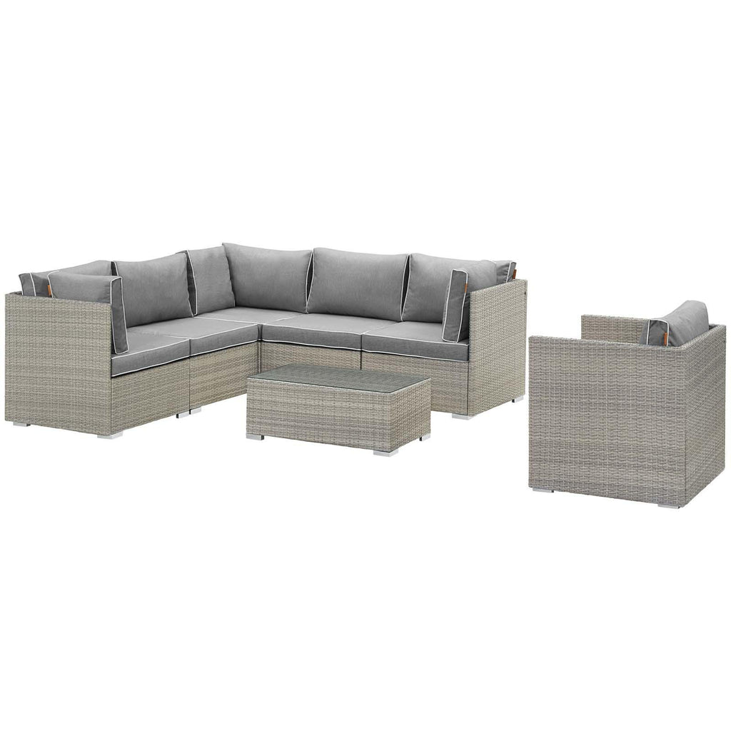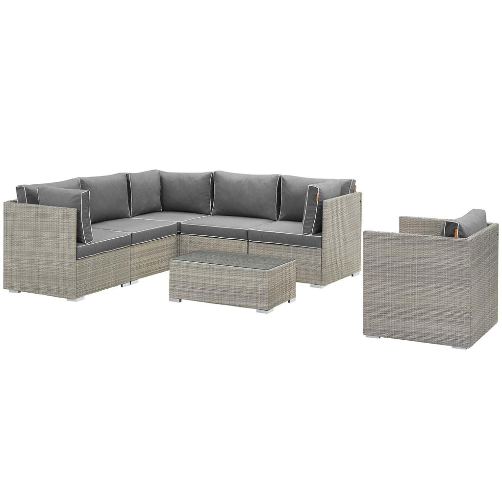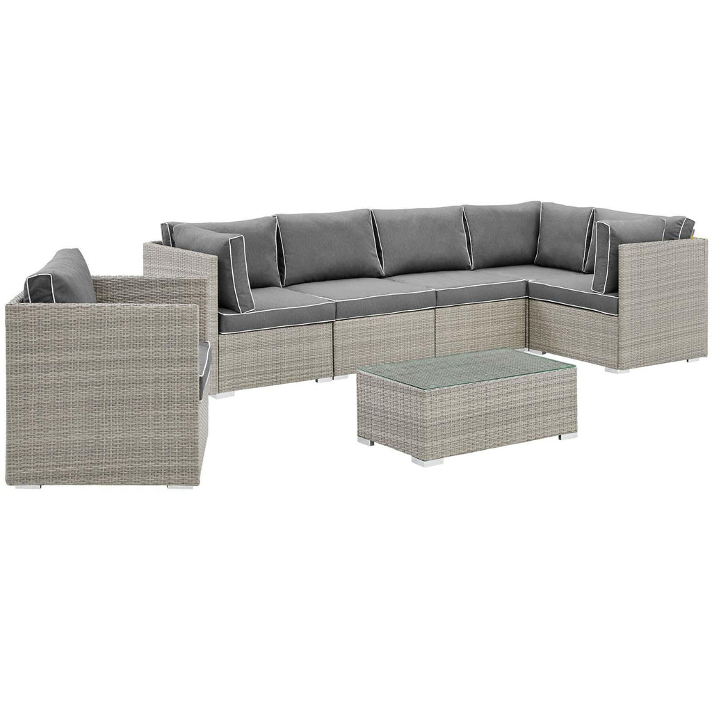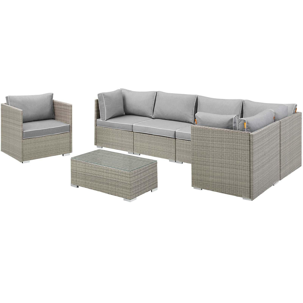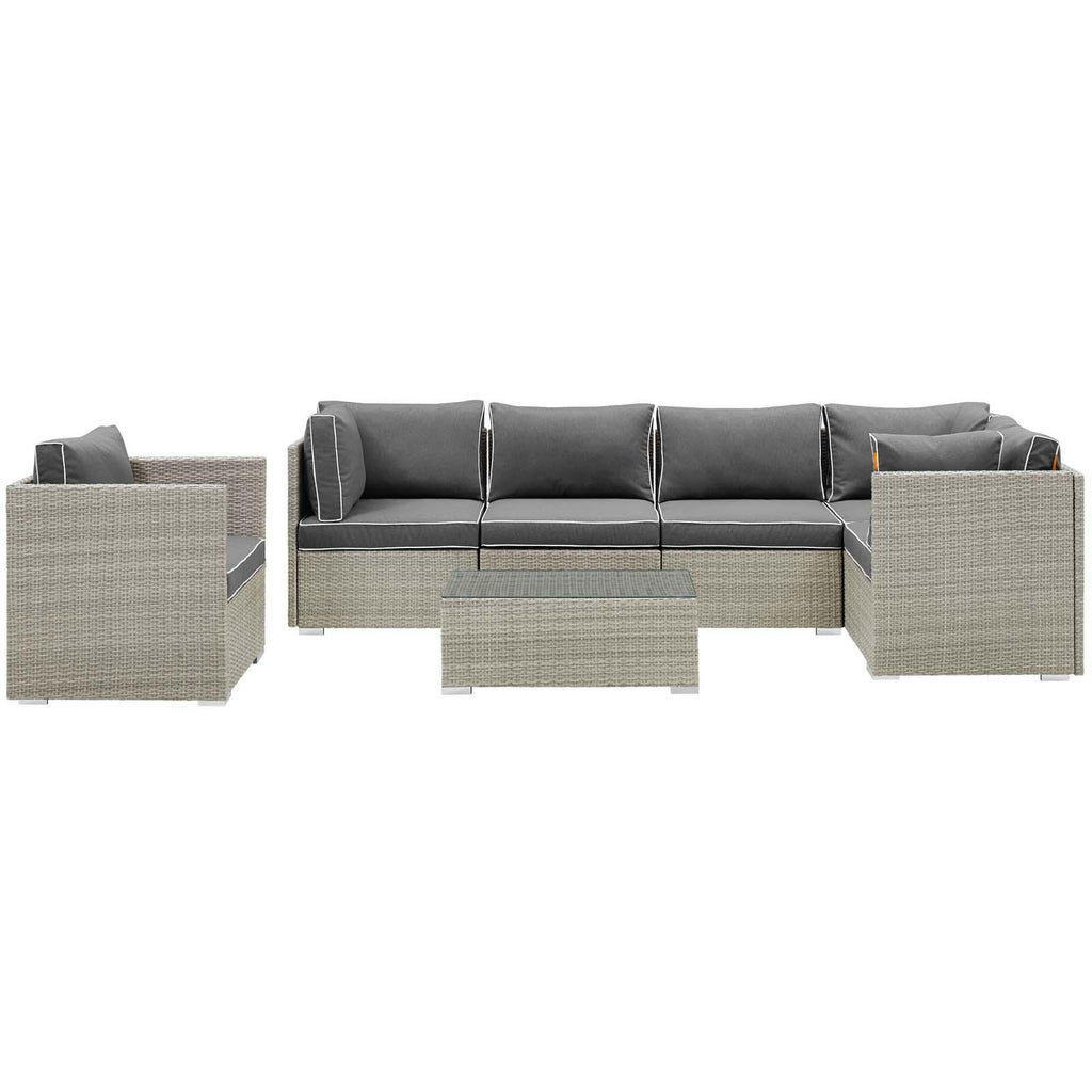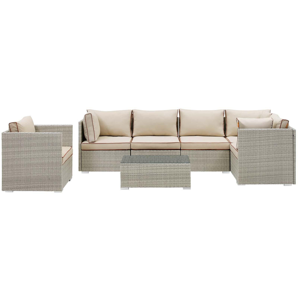 Enjoy the outdoors while benefiting from style and comfort. Repose offers a detailed tan and gray synthetic rattan weave with UV protection for eye-catching appeal and durability, plush 4� thick all-weather polyester cushions with contrasting color French piping, non-marking foot pads, and sturdy powder-coated aluminum framed seats and ottomans that support up to 331 pounds each. Subtle style defines the Repose outdoor sectional collection making it a natural choice for enhancing your patio, backyard, or poolside gatherings.