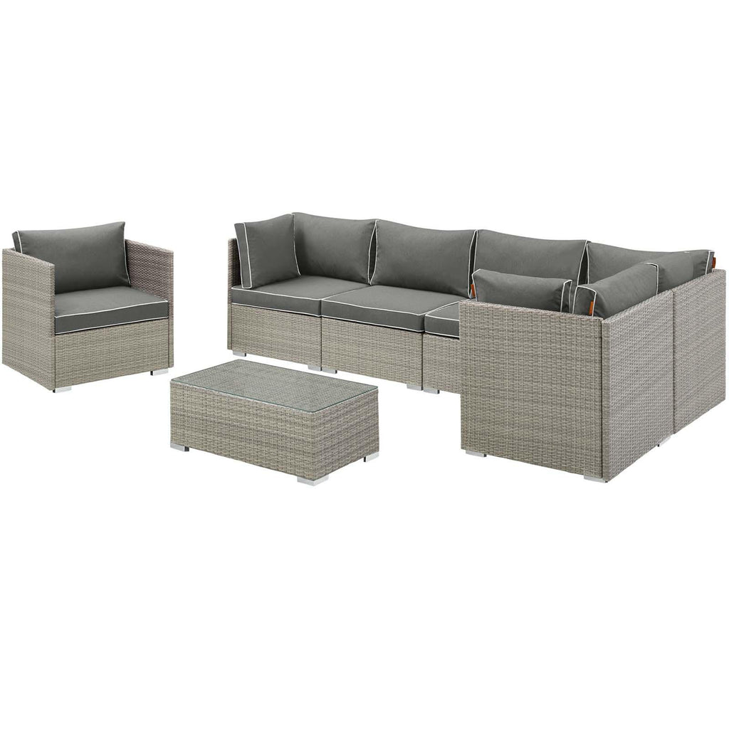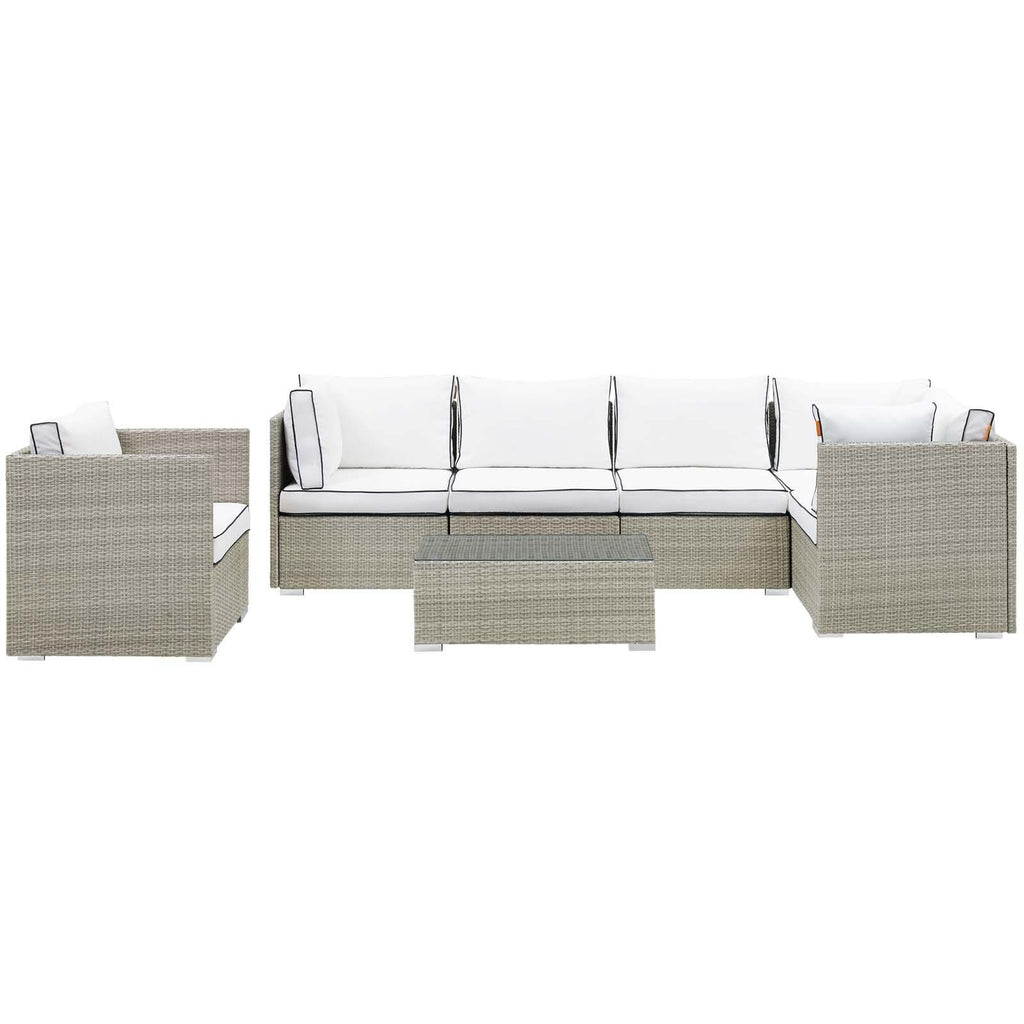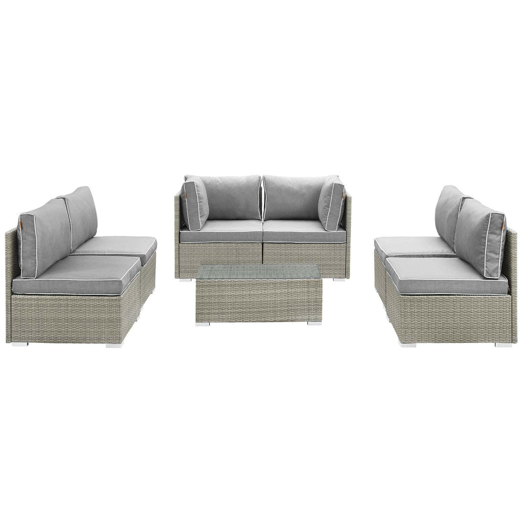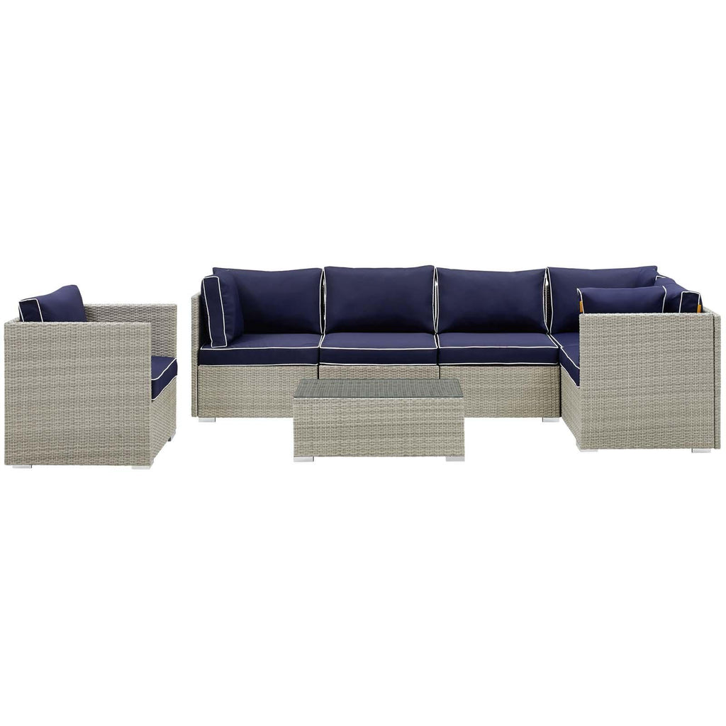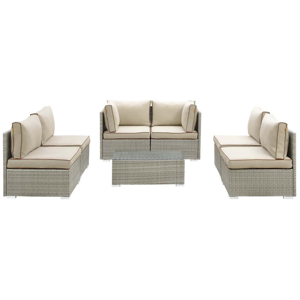 Enjoy the outdoors while benefiting from style and comfort. Repose offers a detailed tan and gray synthetic rattan weave with UV protection for eye-catching appeal and durability, plush 4� thick all-weather polyester cushions with contrasting color French piping, non-marking foot pads, and sturdy powder-coated aluminum framed seats and ottomans that support up to 331 pounds each. Subtle style defines the Repose outdoor sectional collection making it a natural choice for enhancing your patio, backyard, or poolside gatherings.