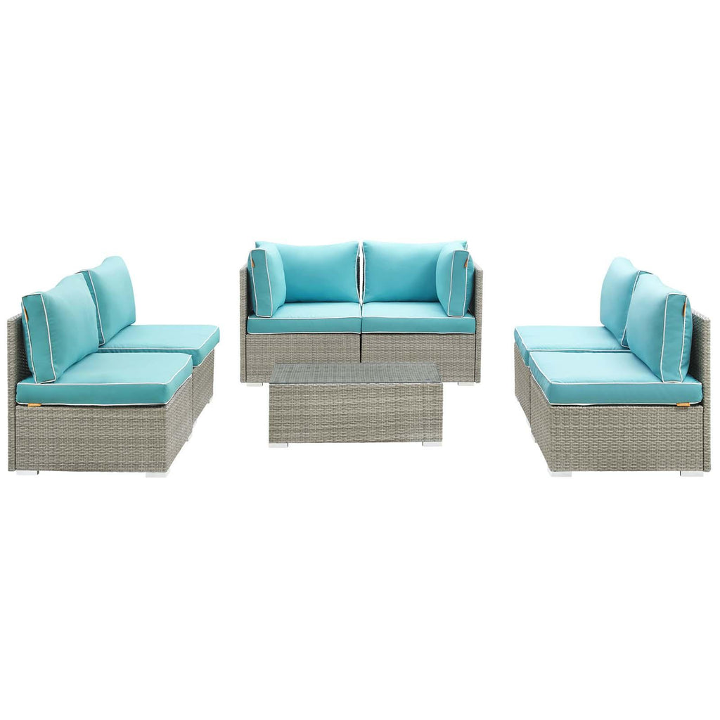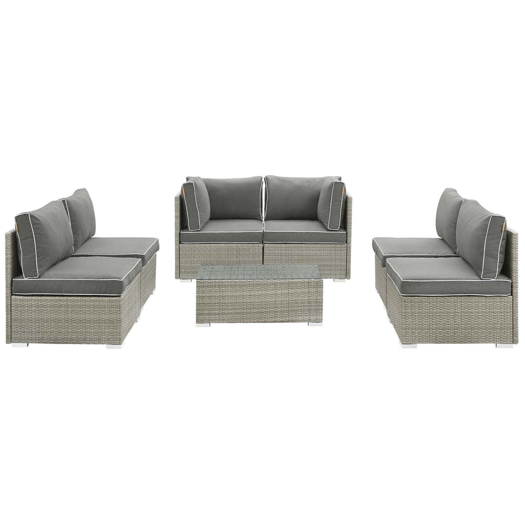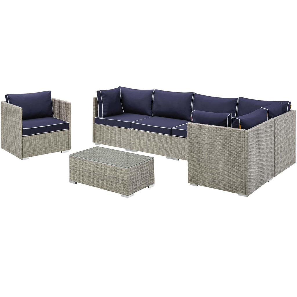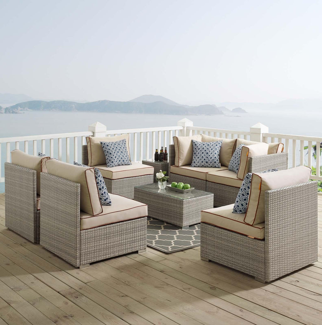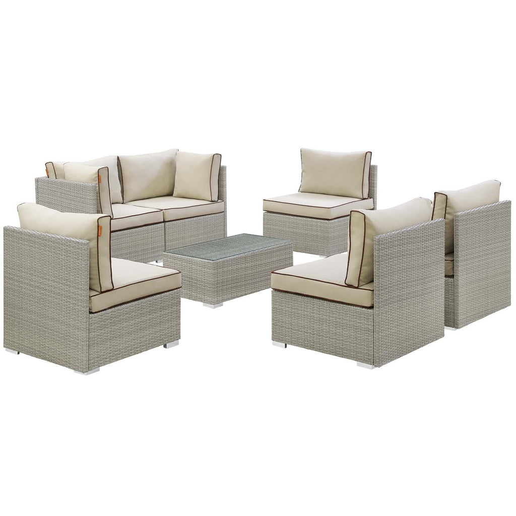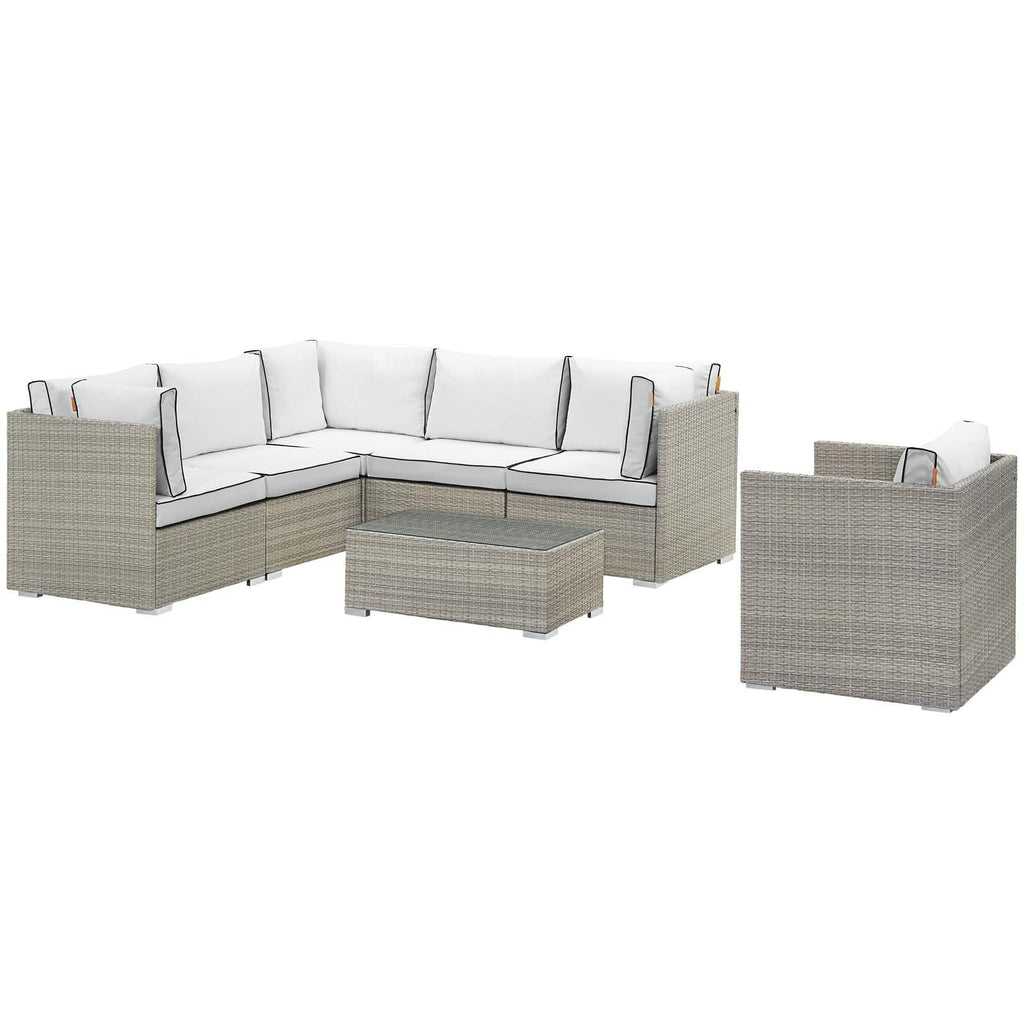 Enjoy the outdoors while benefiting from style and comfort. Repose offers a detailed tan and gray synthetic rattan weave with UV protection for eye-catching appeal and durability, plush 4� thick all-weather polyester cushions with contrasting color French piping, non-marking foot pads, and sturdy powder-coated aluminum framed seats and ottomans that support up to 331 pounds each. Subtle style defines the Repose outdoor sectional collection making it a natural choice for enhancing your patio, backyard, or poolside gatherings.