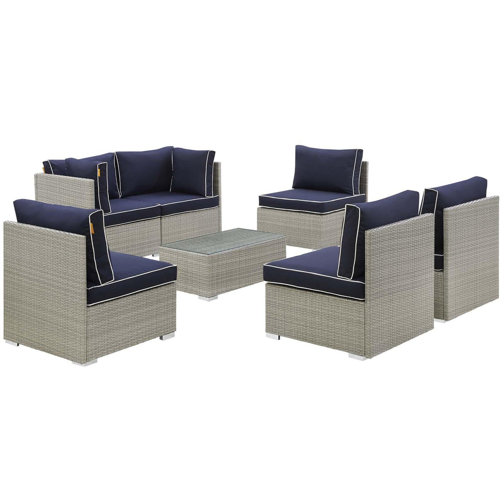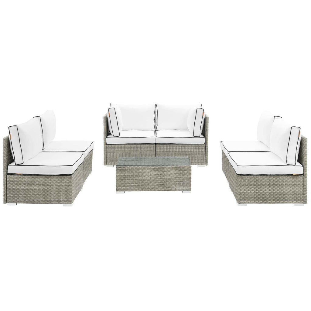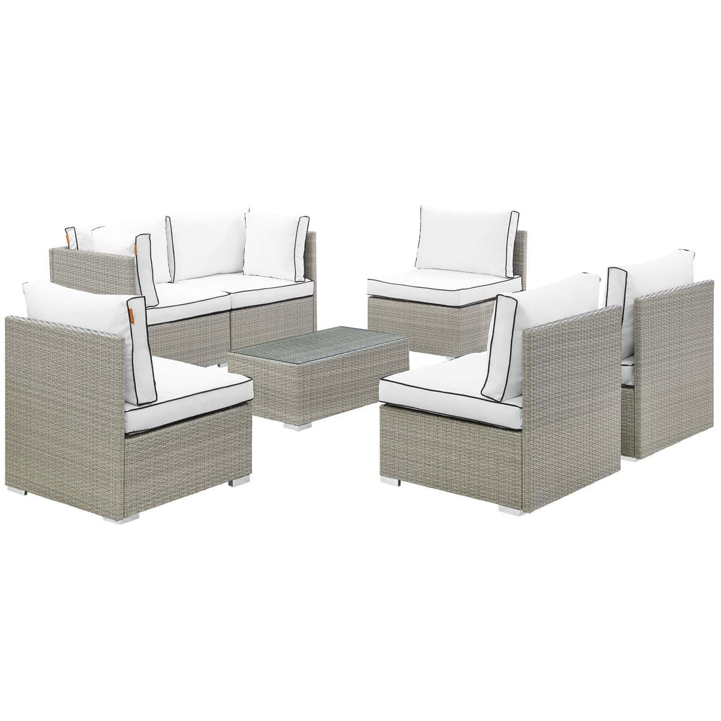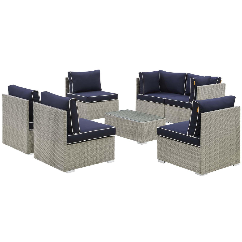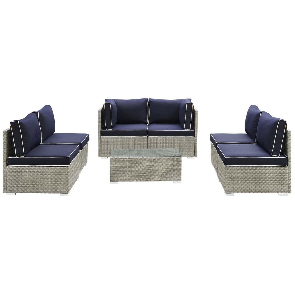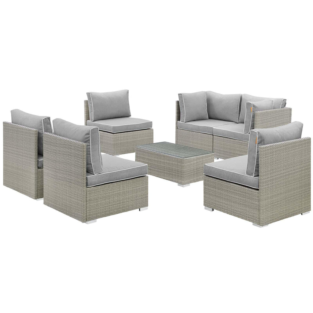 Enjoy the outdoors while benefiting from style and comfort. Repose offers a detailed tan and gray synthetic rattan weave with UV protection for eye-catching appeal and durability, plush 4� thick all-weather polyester cushions with contrasting color French piping, non-marking foot pads, and sturdy powder-coated aluminum framed seats and ottomans that support up to 331 pounds each. Subtle style defines the Repose outdoor sectional collection making it a natural choice for enhancing your patio, backyard, or poolside gatherings.