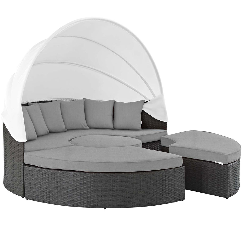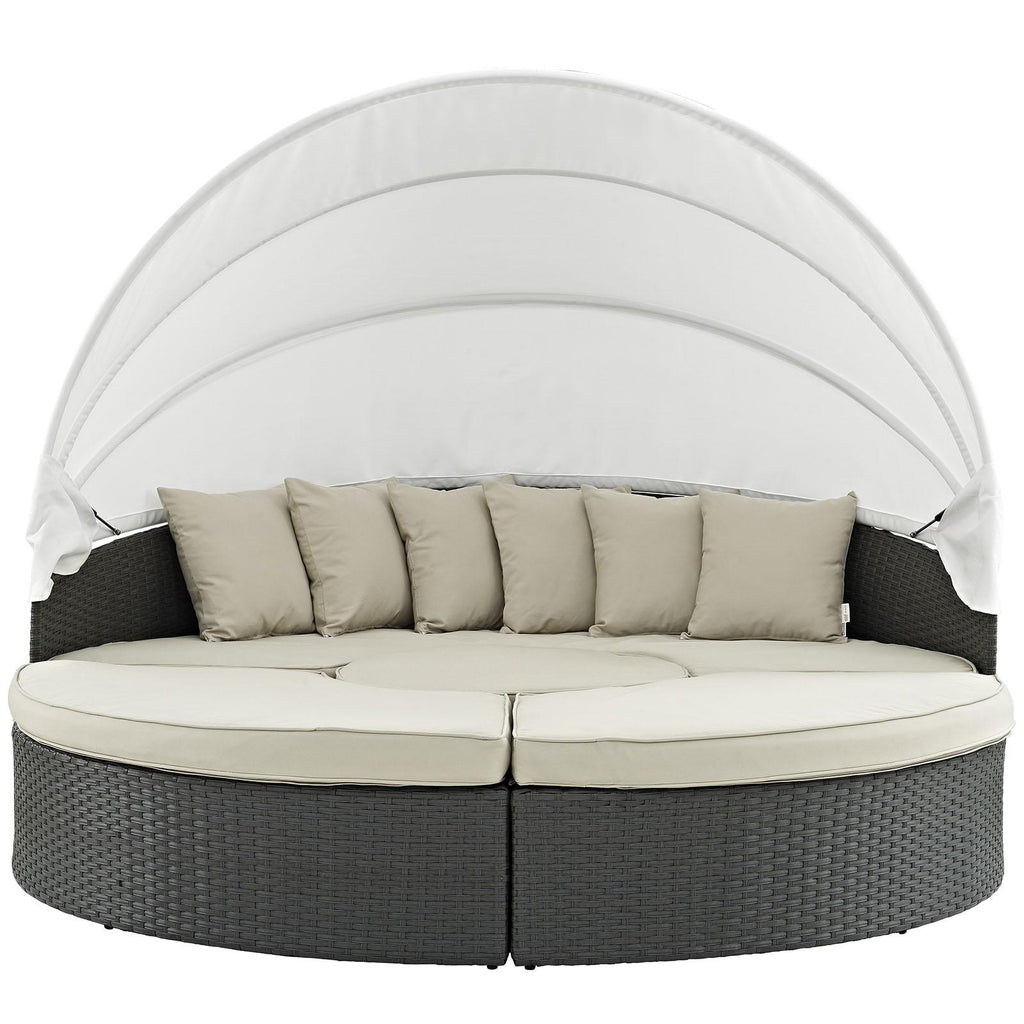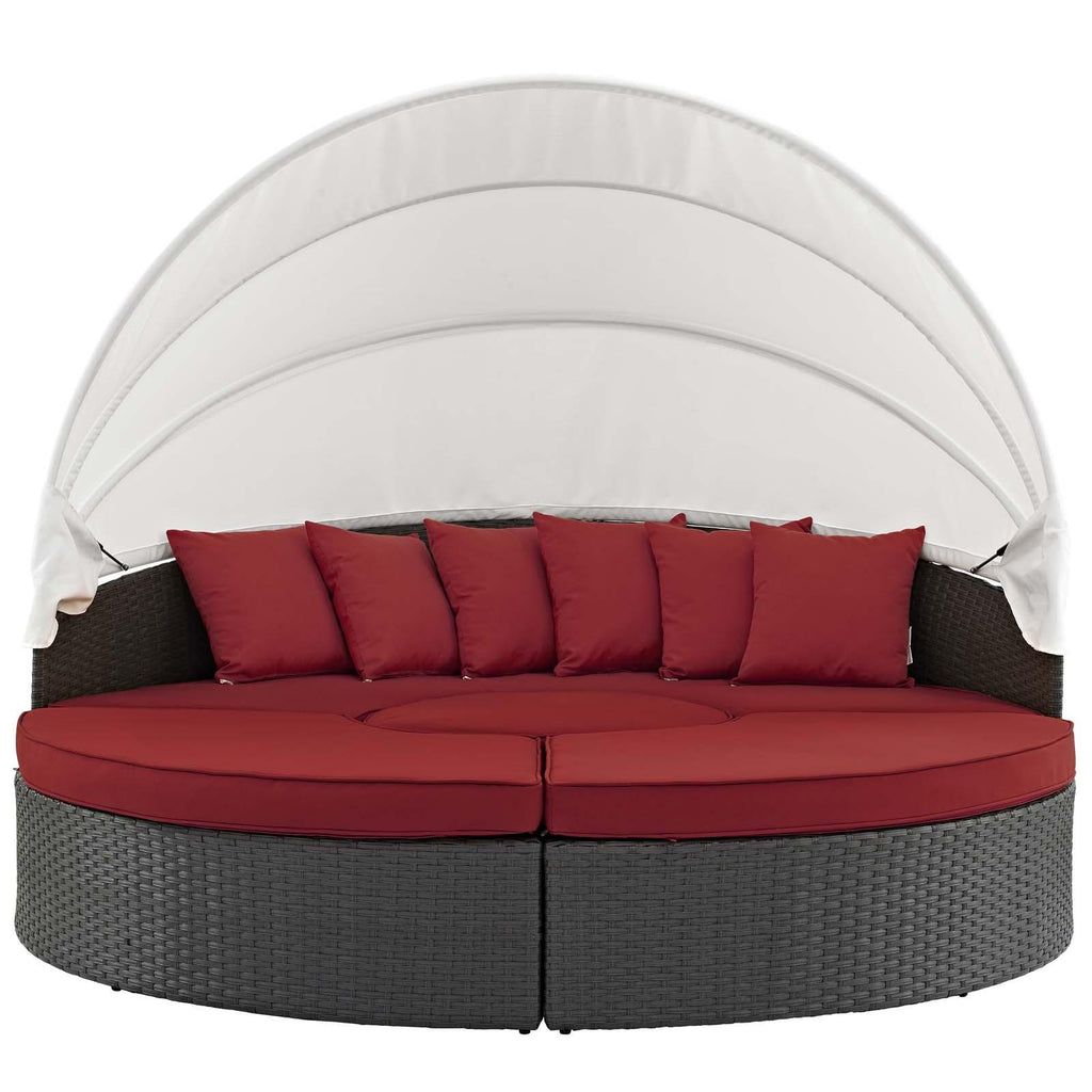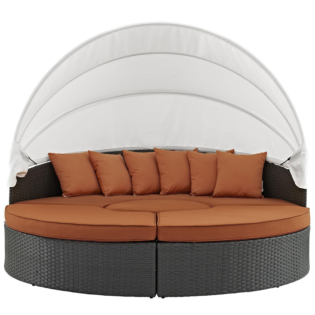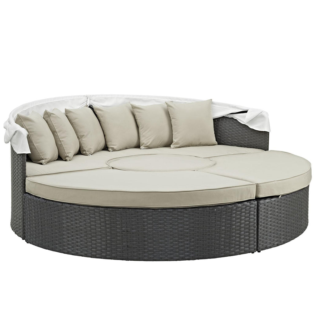 Outfit your patio with an imaginative Sojourn Outdoor Patio Furniture series. The Sojourn Outdoor Sectional Sofa Daybed offers a robust seating experience that easily rearranges according to usage. Outfitted with industry-leading Sunbrella� fabric cushions, synthetic rattan weave, UV protection, powder-coated aluminum frame, immensely enjoy your outdoor time with a daybed that enhances patio, backyard, or poolside areas. This installment of the series is an Outdoor Patio Daybed.
