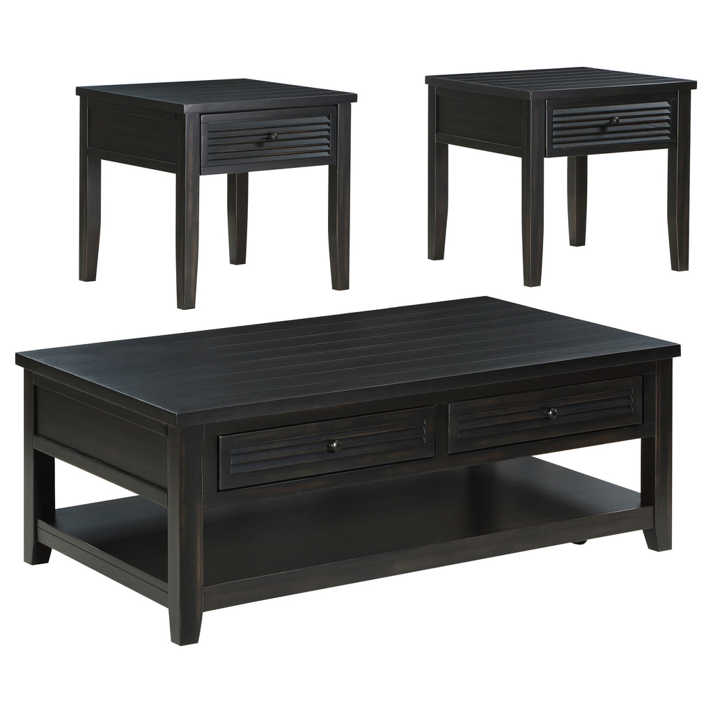Elevate your living room with this stylish coffee table set, blending rustic charm with functional design. Crafted with solid wood legs and an engineered wood frame, each piece features a distressed java finish over pine veneer for a warm, timeless appeal. The planked wood tops and louvered drawer fronts add texture and character, while the drawers provide practical storage solutions. Perfect for creating a cohesive and inviting space, this occasional table set offers both style and convenience. Key Features: • Coffee table set with distressed java finish over pine veneer for a rustic aesthetic • Solid wood legs and engineered wood frame ensure strength and lasting durability • Planked wood tops bring texture and enhance the classic farmhouse design • Louvered drawer fronts add visual interest and unique character to each piece • Multiple drawers provide functional storage for everyday essentials or decor • Combines practicality and timeless style to complete any living room arrangement