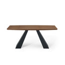 Angular expanse rises gracefully from the Elevate 71� Dining Room Table. The rectangular walnut grain veneer top with subtle curved edges is supported by a triangulated matte black iron base with non-marking foot caps. The Elevate Dining Table is an eye-catching addition to your dining room and kitchen decor, and its versatile construction features elegance suitable for an executive conference room. Solidly crafted from wood and MDF, this dining table boasts sloped edges and striking angular detail. Assembly Required.