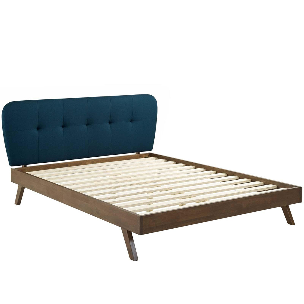 Embrace vintage charm and gentle grace with the Gianna Queen Platform Bed. A single line of button tufting elegantly dots Gianna's centerline highlighting the soft depths of this polyester fabric upholstered queen platform bed. Gianna curves upward from a linear frame gently to crown your bed with organic mid-century style. A sturdy, low-profile laminated veneer wood frame on splayed legs provides a luxurious recline while conversing, relaxing, or reading in bed. Gianna comes with a wood slat support system that eliminates the need for a box spring and accommodates memory foam, spring, latex, and hybrid mattresses. Ideal for farmhouse, rustic, or modern styled bedrooms, Gianna Queen Platform Bed is an updated design perfect for your master suite or guest room. This supportive queen bed frame with a queen size headboards provides support for up to 800 lbs. Set Includes: One - Gianna Queen Platform Bed Contemporary Modern Platform Bed 100% Polyester Fabric Upholstery Solid Wood Bed Frame LVL Wood Slat Support System Box Spring Not Required Assembly Required Bed Weight Capacity: 800 lbs. Overall Product Dimensions: 88.5"L x 69"W x 37.5 - 42.5"H Headboard Dimensions: 2.5"L x 69"W x 27"H Footboard Dimensions: 0.5"L x 61"W x 5"H Side Rail Dimensions: 81.5"L x 63"W x 5"H Floor to Top of Headboard: 37.5 - 42.5"H Floor to Bottom of Headboard: 13.5 - 18.5"H Floor to Top of Side Rail: 13"H Floor to Bottom of Side Rail: 8"H Floor to Bottom of Footboard: 8"H Side Rail Thickness: 0.5"W