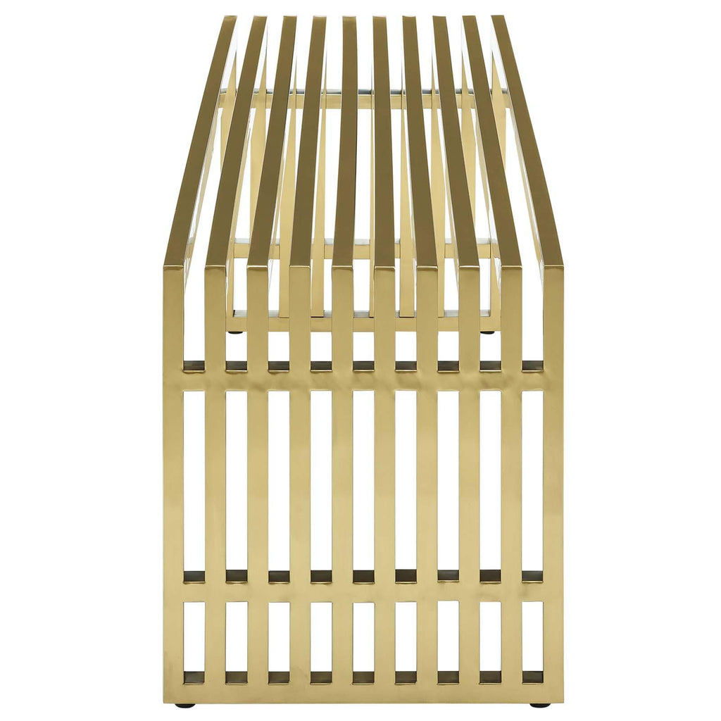 Straight lines were once deemed the realm of strict logic. This conduit design accomplishes something quite profound. It blends linear components with a stylish gold-colored stainless steel tubular effect. Modernism used to be about extremes. Wild shapes and patterns that don�t dare resemble its predecessors. We�ve reached an age of maturity of sorts. We appreciate style, but all the more, we respect those designs that represent a blending of cultures. The Gridiron tubular stainless steel bench is famous not for its radical shape, but for the strategic transcendence that it provides. Gridiron is perfect for reception rooms, living and lounge areas, and any other place in need of transformation. Comes fully assembled.