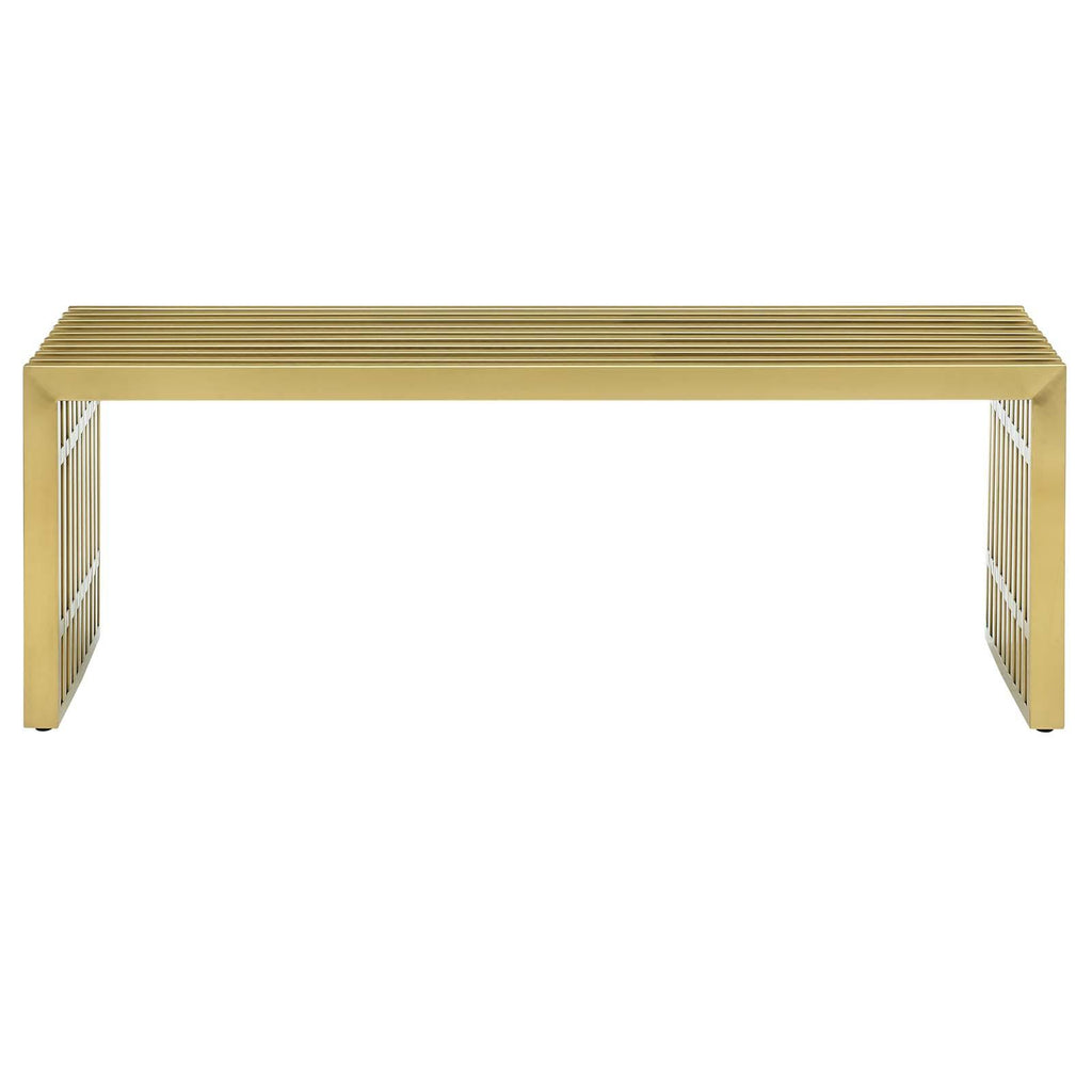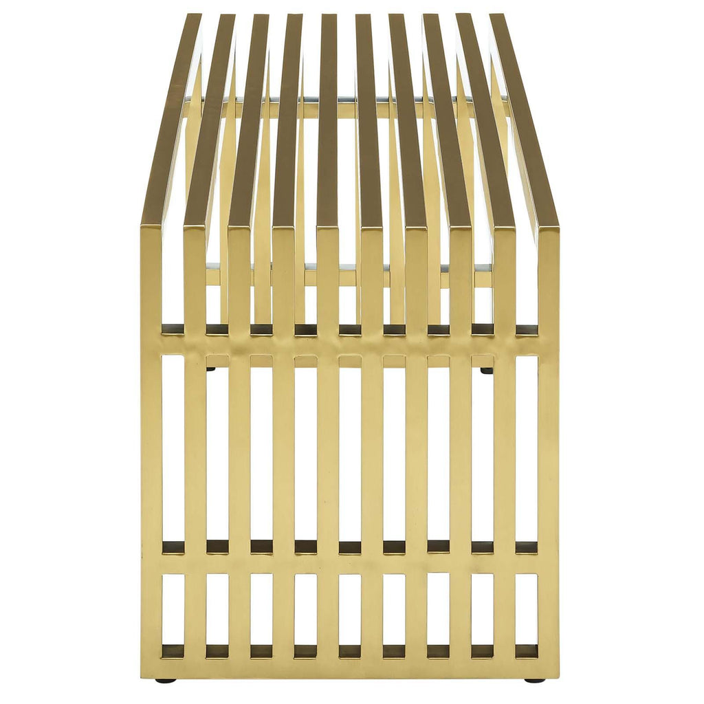 Straight lines were once deemed the realm of strict logic. This conduit design accomplishes something quite profound. It blends linear components with a stylish gold-colored stainless steel tubular effect. Modernism used to be about extremes. Wild shapes and patterns that don�t dare resemble its predecessors. We�ve reached an age of maturity of sorts. We appreciate style, but all the more, we respect those designs that represent a blending of cultures. The Gridiron tubular stainless steel bench is famous not for its radical shape, but for the strategic transcendence that it provides. Gridiron is perfect for reception rooms, living and lounge areas, and any other place in need of transformation. Comes fully assembled.