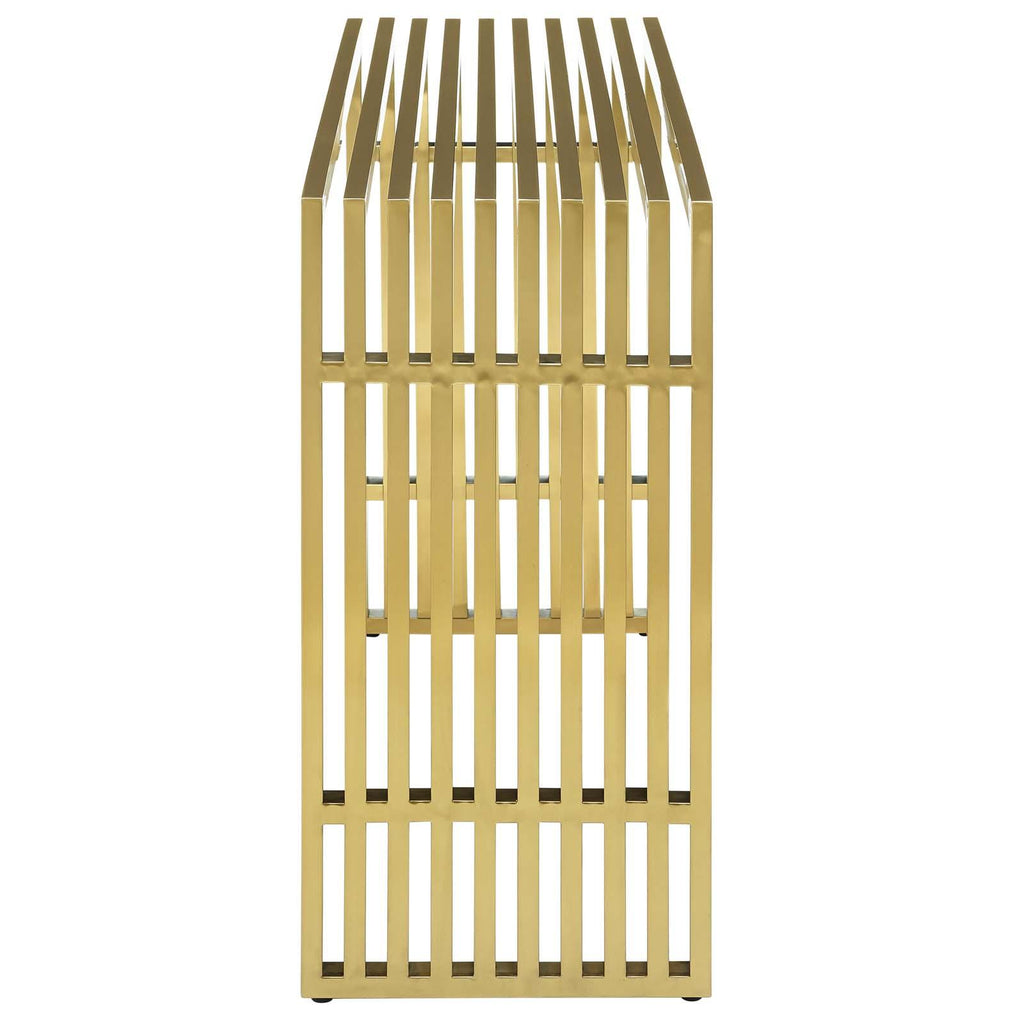 Straight lines were once deemed the realm of strict logic. This conduit design accomplishes something quite profound. It blends linear components with a stylish gold-colored stainless steel tubular effect. Modernism used to be about extremes. Wild shapes and patterns that don�t dare resemble its predecessors. We�ve reached an age of maturity of sorts. We appreciate style, but all the more, we respect those designs that represent a blending of cultures. The Gridiron tubular stainless steel console table is famous not for its radical shape, but for the strategic transcendence that it provides. Gridiron is perfect for reception rooms, living and lounge areas, and any other place in need of transformation. Comes fully assembled.
