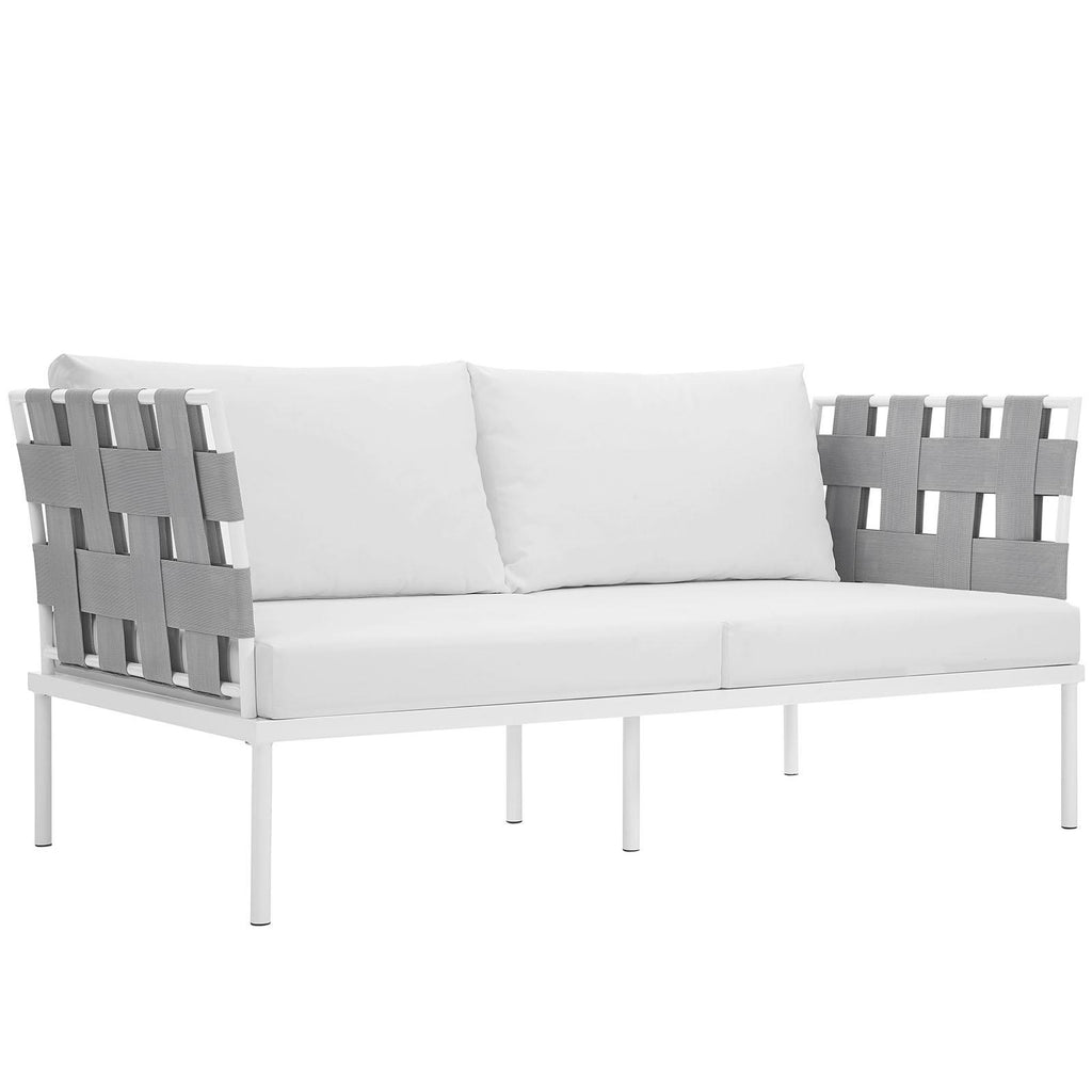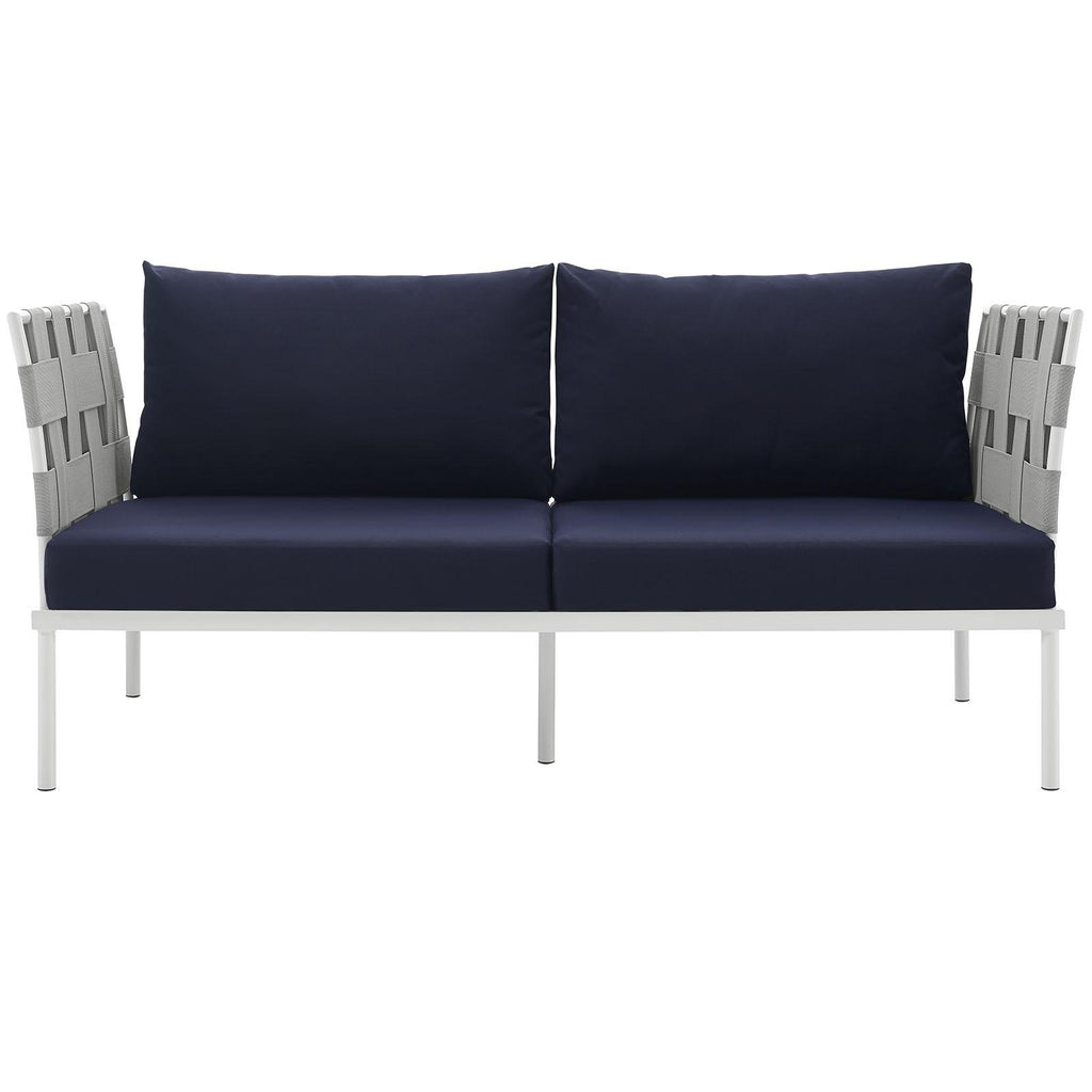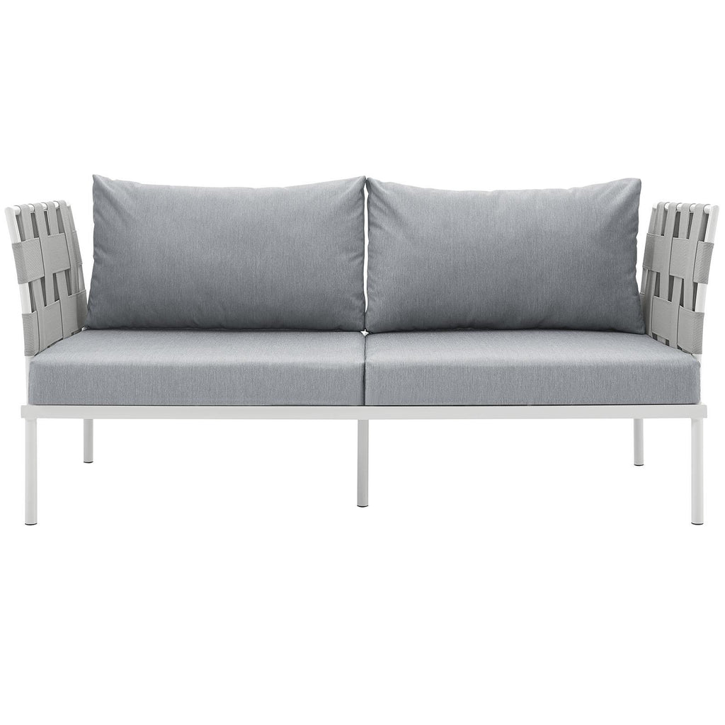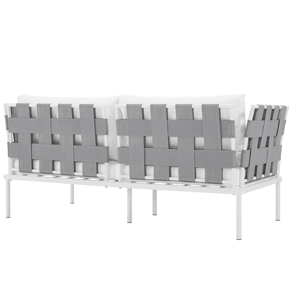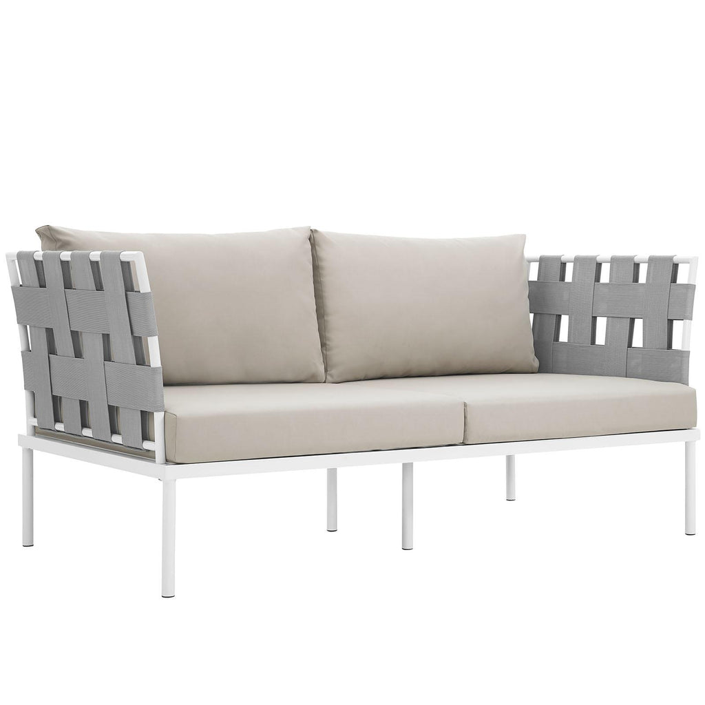 Engage life with Harmony Outdoor Patio 64� Loveseat. Enjoy casual conversation under the open sky with an all-weather waterproof outdoor two seater sofa from a versatile furniture set that delivers an exceptional outdoor porch, patio, balcony or garden experience. An exceptional modern outdoor furniture set that exceeds expectations, Harmony Patio Loveseat comes with silk polyester seat back weave, square powder coated aluminum bases, and non-marking foot caps. An outside loveseat that arranges according to the spontaneous needs of your guests, set your sights on open and inspired moments with the Harmony Outdoor Patio Collection. Set Includes: One - Harmony Loveseat All-Weather Canvas Fabric Comfortable Dense Foam Padding Powder-Coated Aluminum Frame Non-Marking Black Plastic Foot Caps Machine Washable Cushions Assembly Required Loveseat Weight Capacity: 440 lbs Overall Product Dimensions: 32.5"L x 64"W x 32"H Seat Dimensions: 30.5"L x 63"W x 15.5"H