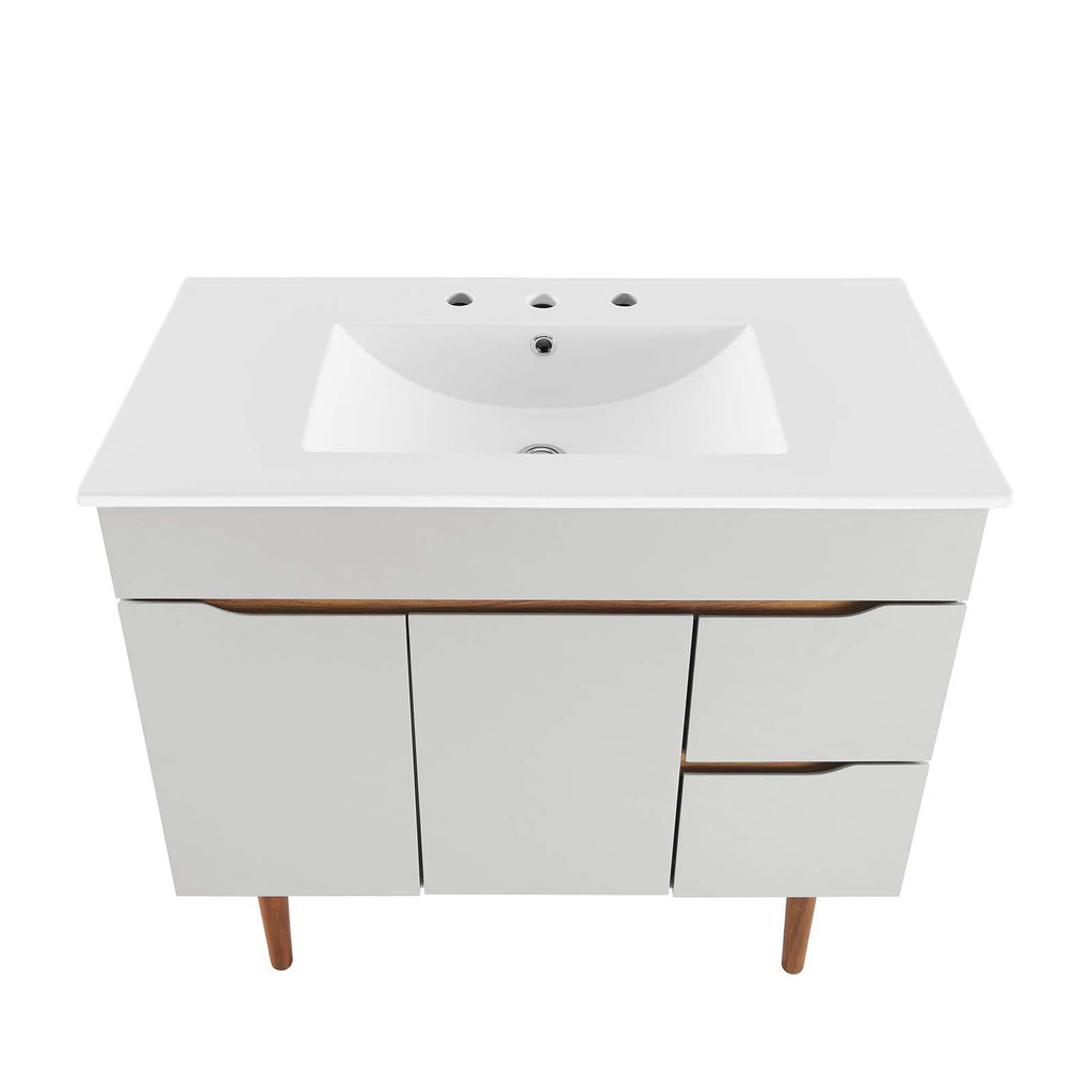 Instill the whispered elegance required to complete your bathroom decor with the Harvest 36" Mid-Century Modern Bathroom Vanity. The Harvest Bathroom Vanity features a durable MDF frame with a matte finish laminate, four tapered mahogany wood legs, two spacious drawers, and ample storage space behind two soft-close hinged doors. An integrated countertop and 8" centerset ceramic sink basin continue the sleek look with Scandinavian modern style design for a quietly bold vanity designed for a multitude of decor styles. This vanity features solid construction with a cutaway design on top of the dual doors and drawers for easy open and close functionality. Assembly required and fixtures not included.