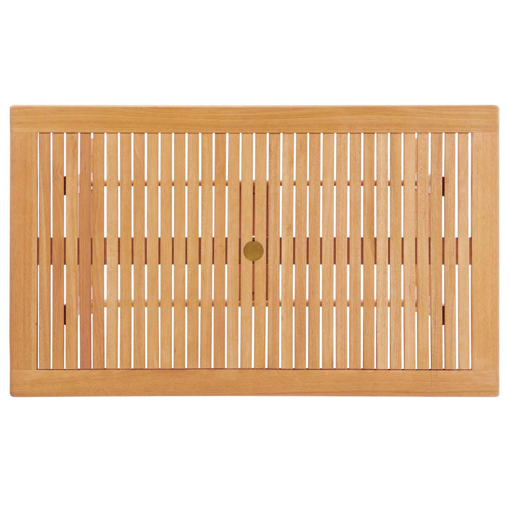 Reinvent the elegance of minimalism with the Hatteras Outdoor Dining Set. This set is comprised of the Hatteras Eucalyptus Wood 36" Square Dining Table and Hatteras Eucalyptus Wood Dining Armchairs. Hatteras has a refreshing back to basics feel that elevates your patio decor to new heights. Solidly constructed from FSC certified eucalyptus wood, the wood slats give this set a natural airflow for enjoyable dining and comfortable lounging. The Hatteras Outdoor Patio Dining Set has an organic design ideal for the patio, poolside, porch, backyard, or deck. Table features a 2� umbrella slot with a gold metal protective cover.