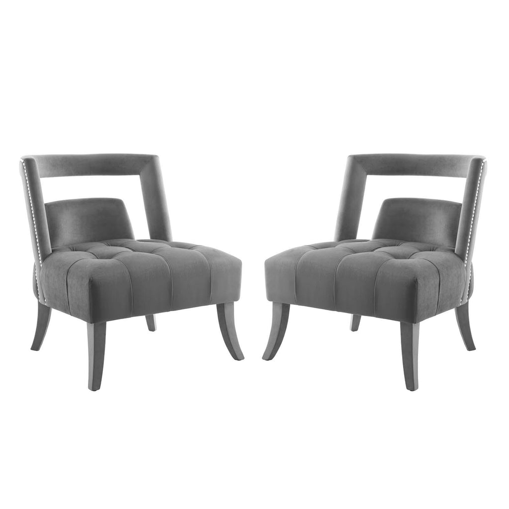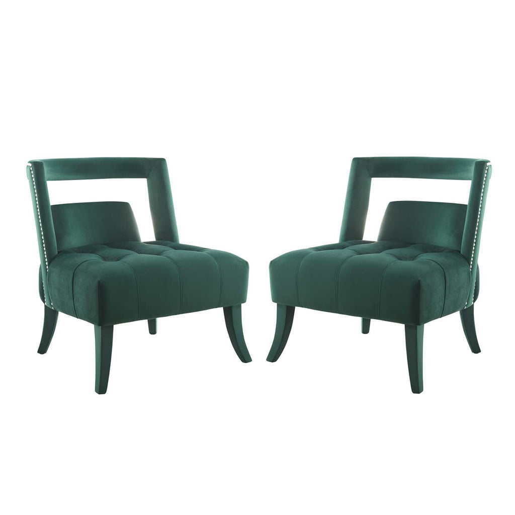 Make a statement with the visually impactful Honor Performance Velvet Accent Lounge Armchair. Honor's cut-away open design gives way to a plush seat cushion with dense foam padding for a premium seat experience. An elegant accent chair, Honor comes upholstered in soft, stain-resistant performance velvet fabric with deep biscuit tufted buttons and nailhead trim for a rich, timeless look. Supported on four splayed velvet upholstered wood legs, add luxury comfort to your living room, entryway, bedroom or lounge area with this cozy accent chair. Includes non-marking foot caps and supports up to 300 lbs.