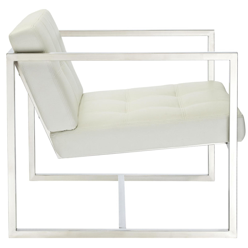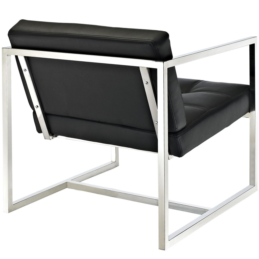 Embrace mid-century elements with this welcoming reception seating chair. Hover is a modern chair, but not for the typical reasons. Its padded vinyl buttoned seat and back and geometric stainless steel frame truly develop space and form in an innovative way. Hover is perfect both for those offices looking to impress new clients and for anyone who ever dreamed of stationary flight.