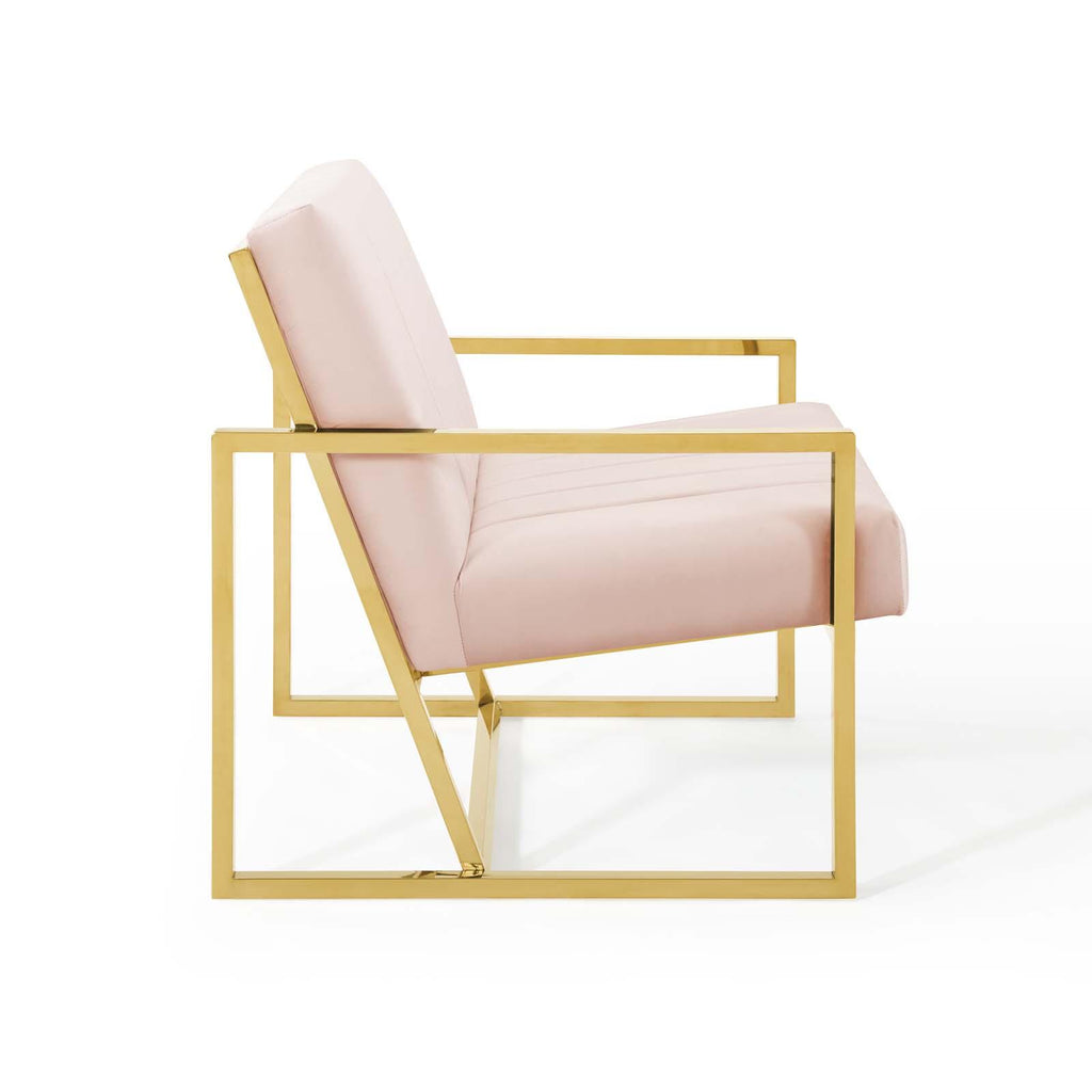Style the canvas of your living room with the crisply elegant Inspire Channel Tufted Performance Velvet Upholstered Accent Armchair. The crisp lines of the vertical channel tufting seamlessly flow into the geometric polished gold stainless steel frame for a living room chair that stands out in your lounge decor. Dense foam padding and an spring coil support system present comfort unrivaled for an accent armchair your friends and family will be drawn to relax in at every gathering. Soft and durable stain-resistant performance velvet polyester upholstery provides tactile luxury for the solidly constructed glam deco Inspire Accent Chair while non-marking foot caps provide protection for your floors. No Assembly Required. Chair Weight Capacity: 441 lbs.