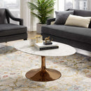 Reflecting a seamless organic shape and timeless form, the Lippa coffee table has become a symbol of modernism for over the past 60 years. Before its release, homes were filled with clunky remnants of an industrial age long gone by. But in order to advance into the new world, homes first had to transition from the traditional square table, into a piece that connoted progress. The base and dimensions are true to the original specifications, while the table�s oval-shaped artificial marble top, and tapered metal base, are carefully lacquered with a scratch and chip resistant finish.