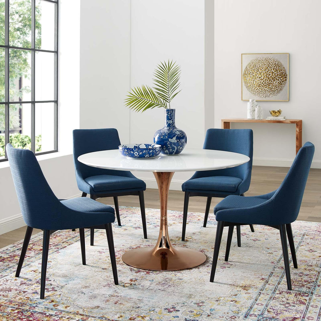 Reflecting a seamless organic shape and timeless form, the Lippa dining table has become a symbol of modernism for over the past 60 years. Before its release, homes were filled with clunky remnants of an industrial age long gone by. But in order to advance into the new world, homes first had to transition from the traditional square table, into a piece that connoted progress. The base and dimensions are true to the original specifications, while the table�s circular white top and metal tapered base are carefully lacquered with a chip-resistant finish. Set Includes: One - Lippa 47" Round Dining Table Chip Resistant Finish Coated Top Powder-Coated Metal Base Overall Product Dimensions: 47"L x 47"W x 28.5"H Floor to underside of table: 27.5"H Table Top Thickness: 1"H Width of Legs: 23.5"W