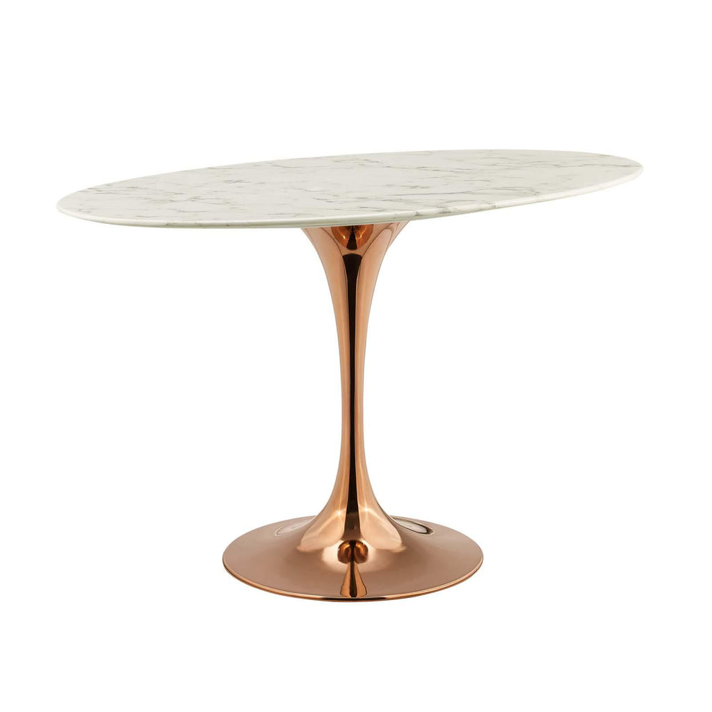 Reflecting a seamless organic shape and timeless form, the Lippa dining table has become a symbol of modernism for over the past 60 years. Before its release, homes were filled with clunky remnants of an industrial age long gone by. But in order to advance into the new world, homes first had to transition from the traditional square table, into a piece that connoted progress. The base and dimensions are true to the original specifications, while the table�s oval-shaped artificial marble top, and tapered metal base, are carefully lacquered with a scratch and chip resistant finish.