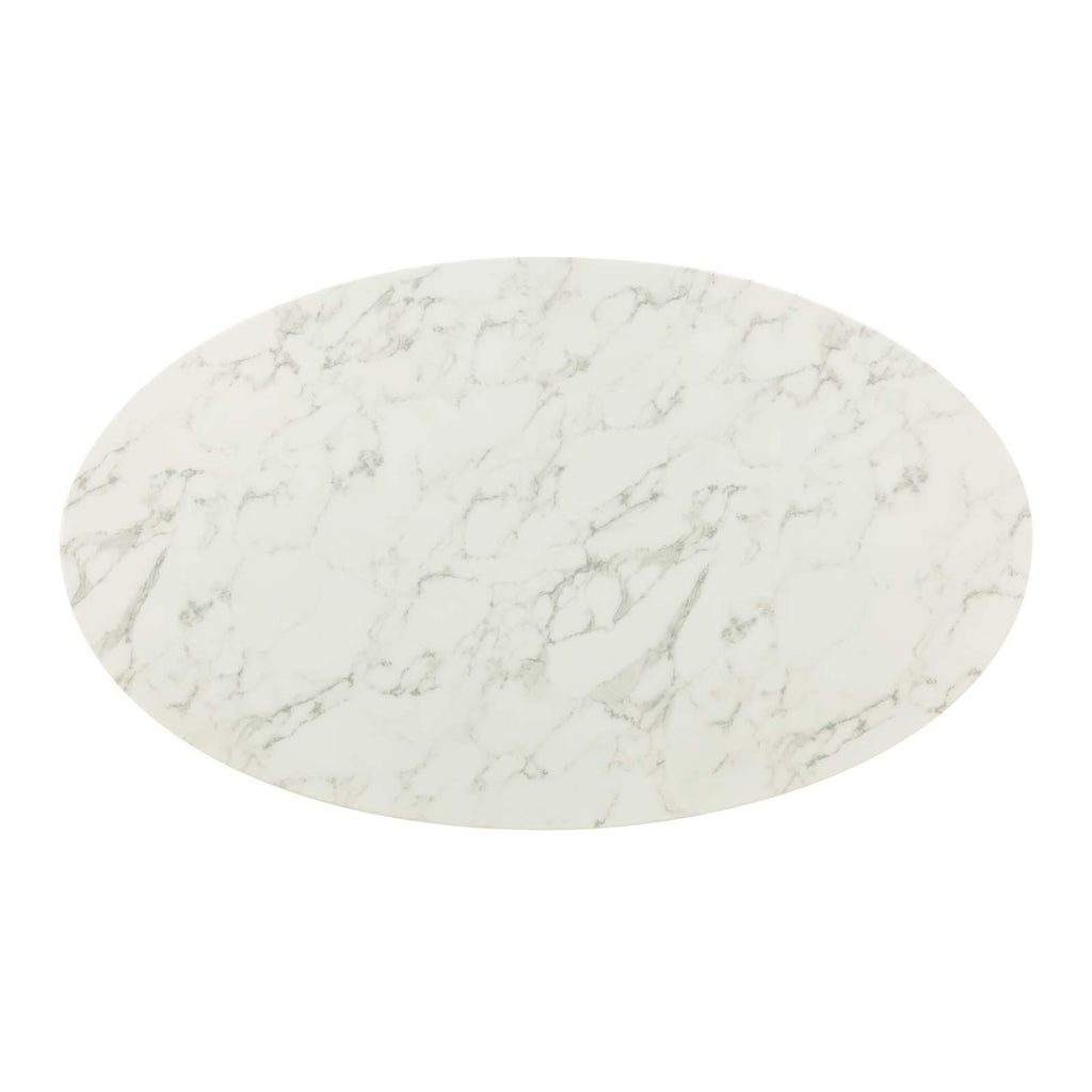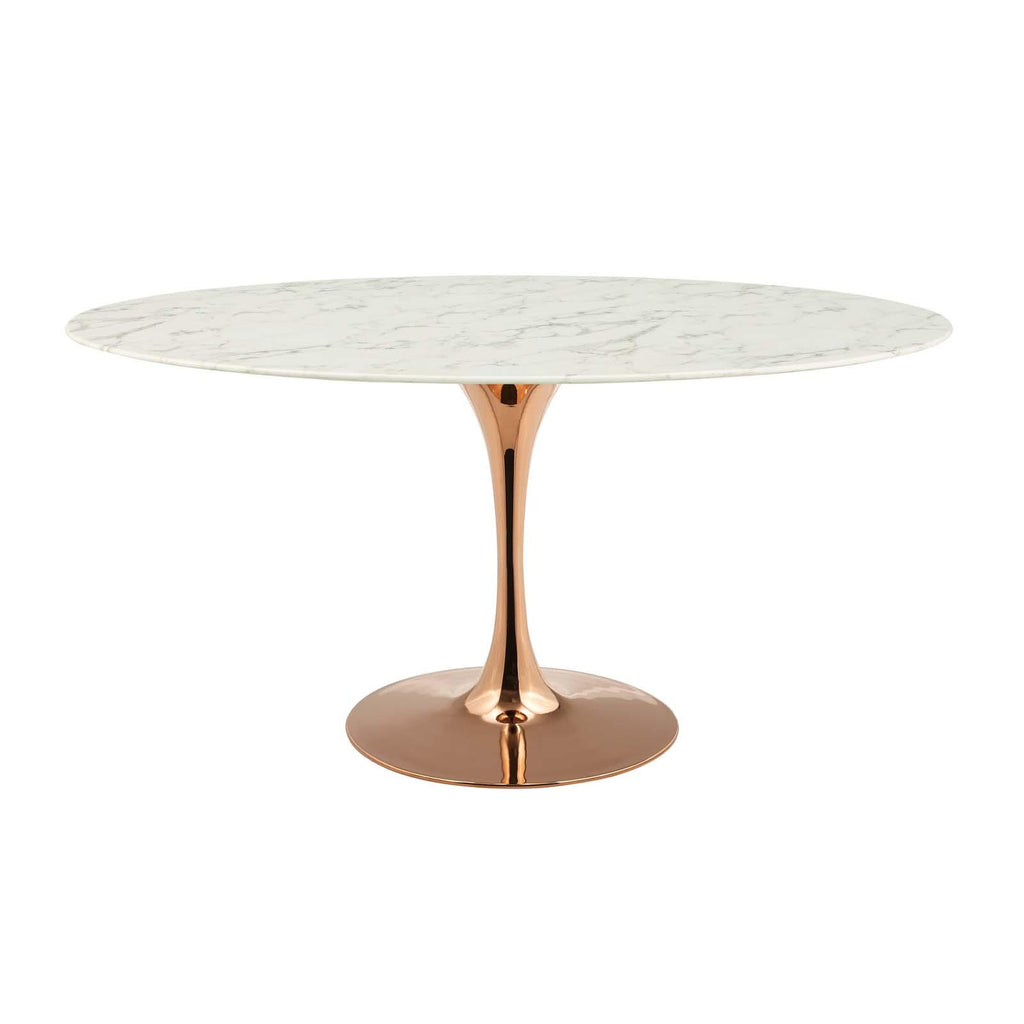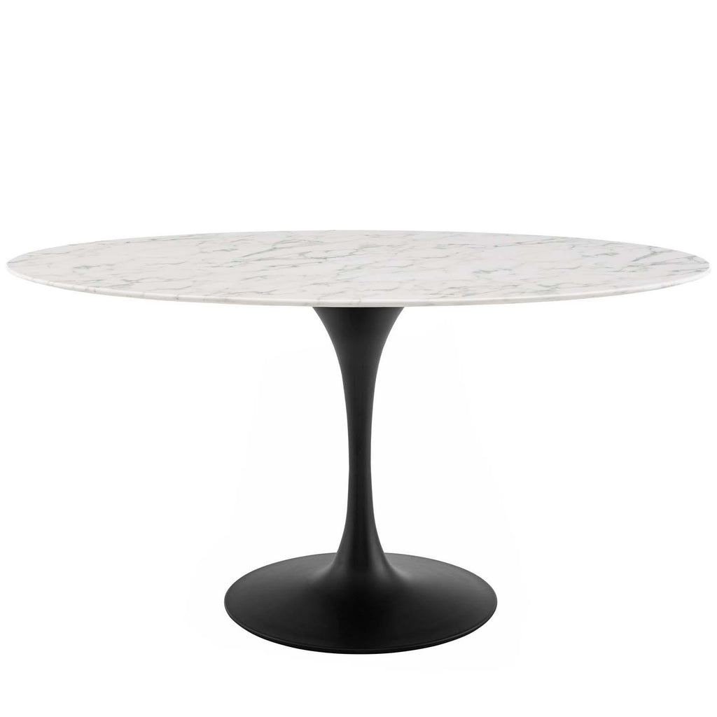 Reflecting a seamless organic shape and timeless form, the Lippa dining table has become a symbol of modernism for over the past 60 years. Before its release, homes were filled with clunky remnants of an industrial age long gone by. But in order to advance into the new world, homes first had to transition from the traditional square table, into a piece that connoted progress. The base and dimensions are true to the original specifications, while the table�s oval-shaped artificial marble top, and tapered metal base, are carefully lacquered with a scratch and chip resistant finish.