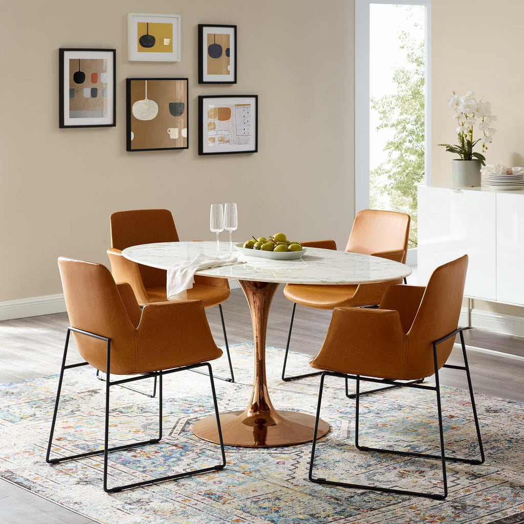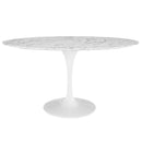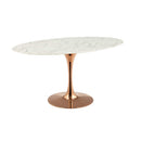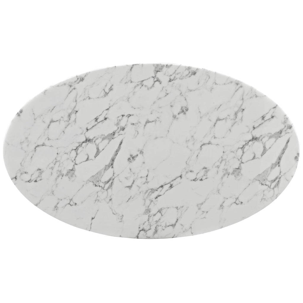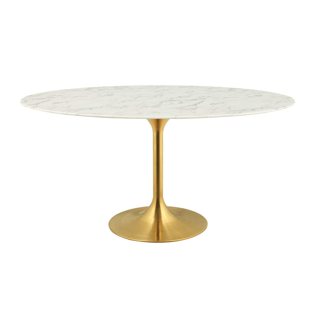 Reflecting a seamless organic shape and timeless form, the Lippa dining table has become a symbol of modernism for over the past 60 years. Before its release, homes were filled with clunky remnants of an industrial age long gone by. But in order to advance into the new world, homes first had to transition from the traditional square table, into a piece that connoted progress. The base and dimensions are true to the original specifications, while the table�s oval-shaped artificial marble top, and tapered metal base, are carefully lacquered with a scratch and chip resistant finish.