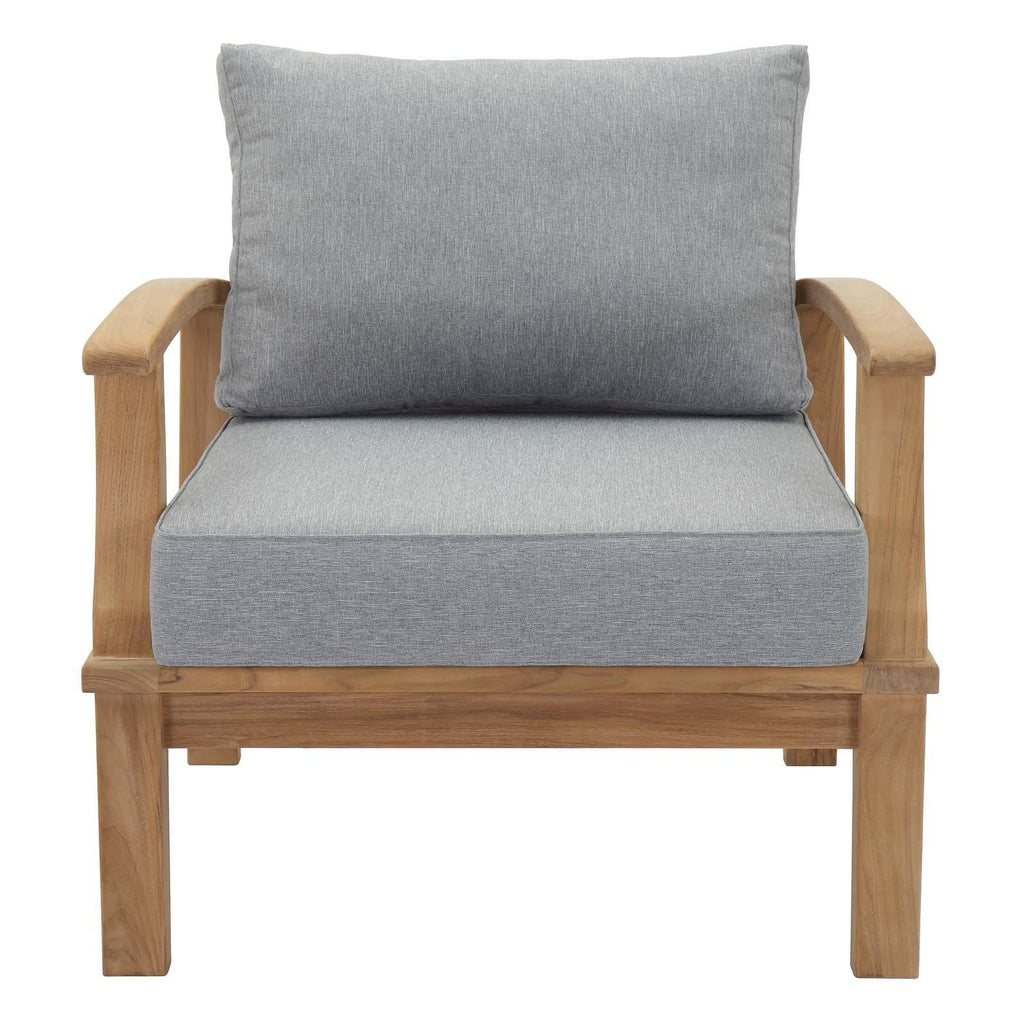 Harbor your greatest expectations with the luxurious Marina Teak Wood Outdoor Patio Arm Chair. Marina Patio Arm Chair has a seating arrangement perfect for every member of your crew as you breathe the fresh, crisp air of a day spent with friends and family. Known for its natural ability to withstand extreme weather conditions, teak is the wood selection of choice for long-lasting outdoor patio furniture. Now you can enjoy Marina Teak Wood Outdoor Arm Chair with its durable construction and all-weather cushions. Assembly required. Please note that while the covers on your new outdoor set are composed of strongly water-repellent material, if left out in the rain or within the range of sprinklers, they will absorb moisture through the seams. We suggest covering or storing your new cushions indoors when not in use. If the cushions do get wet, stand them on their sides to allow the water to drain out. For cleaning, use only mild dish soap and water, never use harsh chemicals. Set Includes: One - Marina Outdoor Patio Teak Armchair Solid teak wood construction Richly textured wood graining Water & UV Resistant Cushions Machine Washable Covers Grade A Premium Teak Overall Product Dimensions: 31.5"L x 32.5"W x 31.5"H Seat Dimensions: 26"L x 31"W x 12"H Backrest Height: 20"H Armrest Height: 12"H Back Cushion Dimensions: 25"L x 17.5"W x 4"H Seat Cushion Dimensions: 25"L x 26.5"W x 5"H