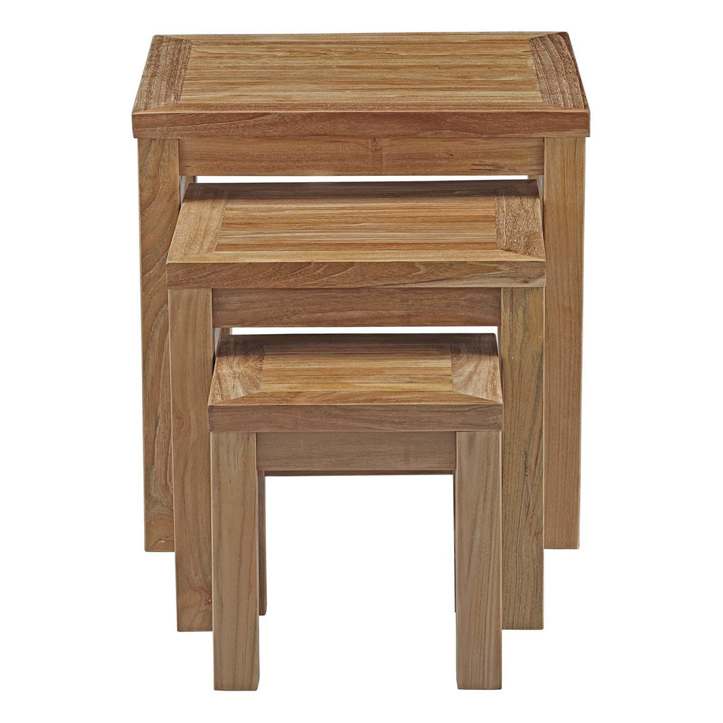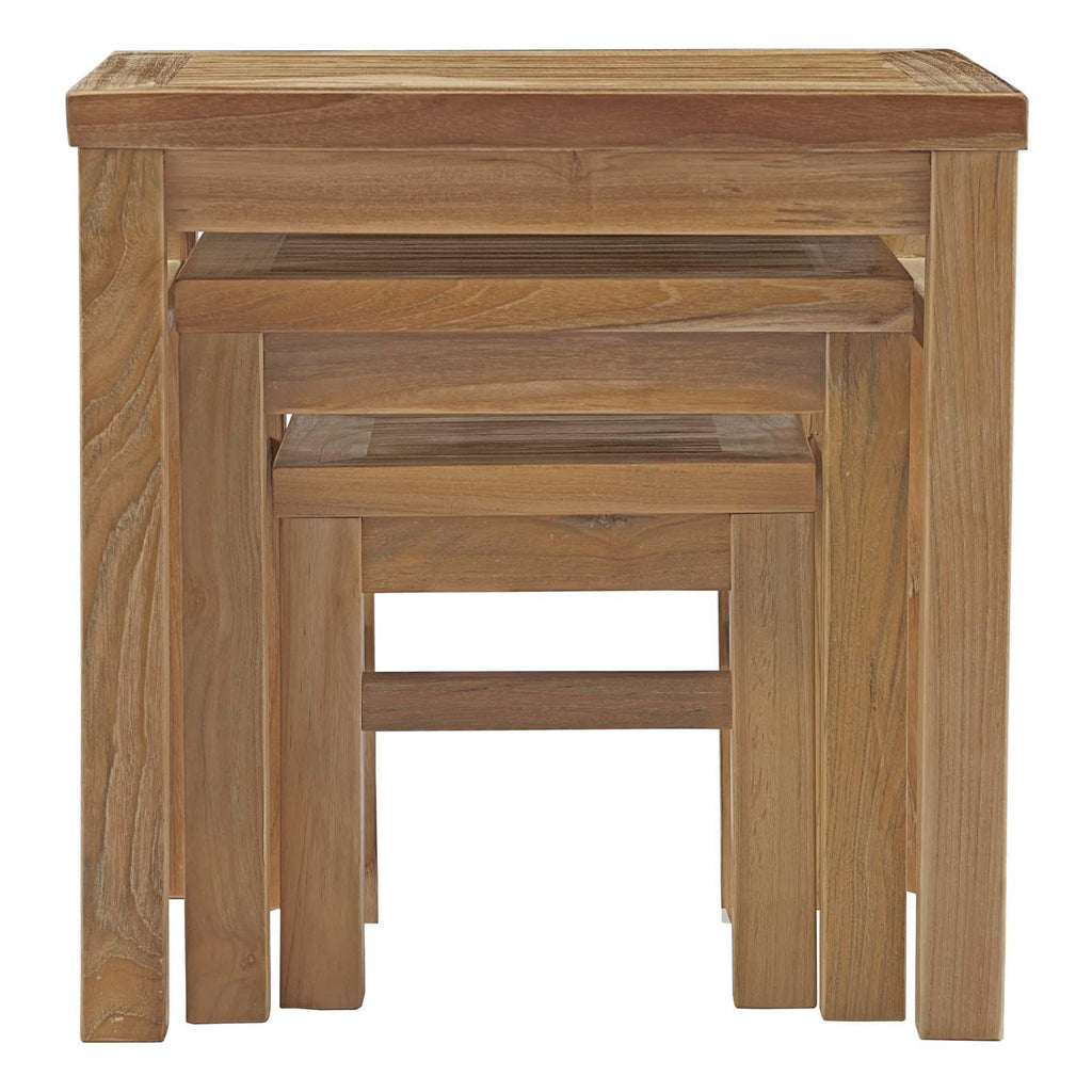 Harbor your greatest expectations with the luxurious Marina Teak Wood Outdoor Patio Nesting Table 3 piece set. Marina Patio nesting table set has a seating arrangement perfect for every member of your crew as you breathe the fresh, crisp air of a day spent with friends and family. Known for its natural ability to withstand extreme weather conditions, teak is the wood selection of choice for long-lasting outdoor patio furniture. Now you can enjoy Marina Teak Wood Outdoor Nesting Table set with its durable construction, alongside a modern design that persistently looks new and welcoming in your patio dining environs. Assembly required.