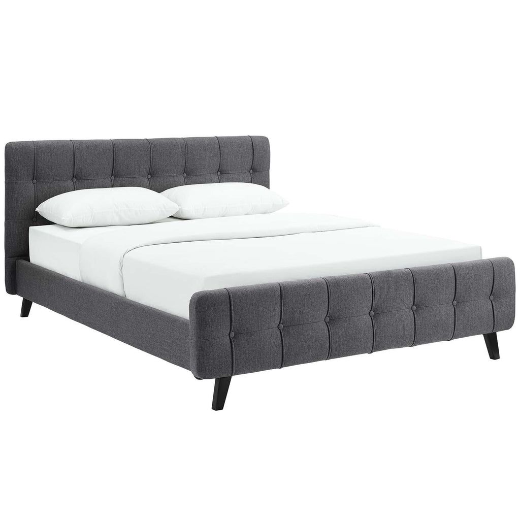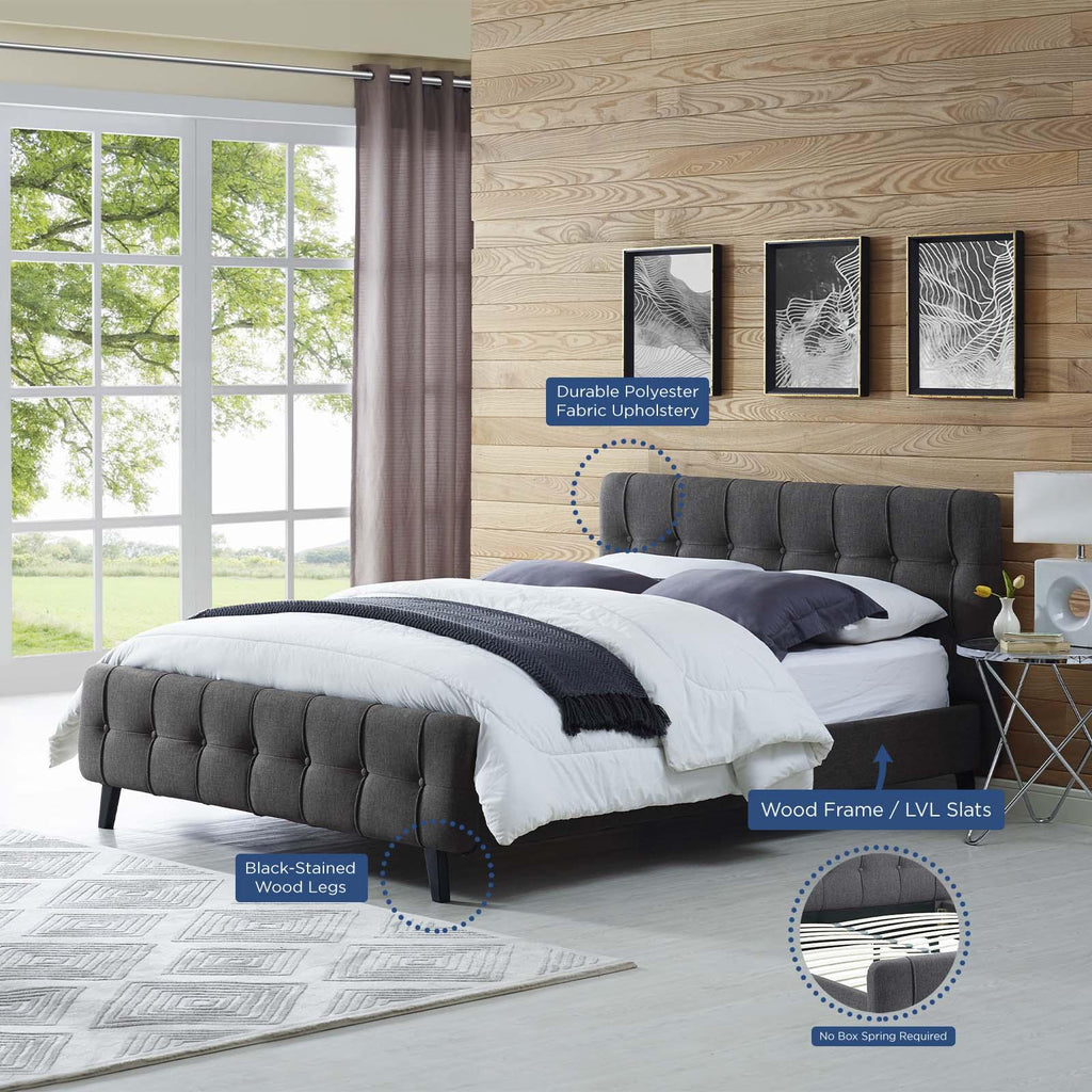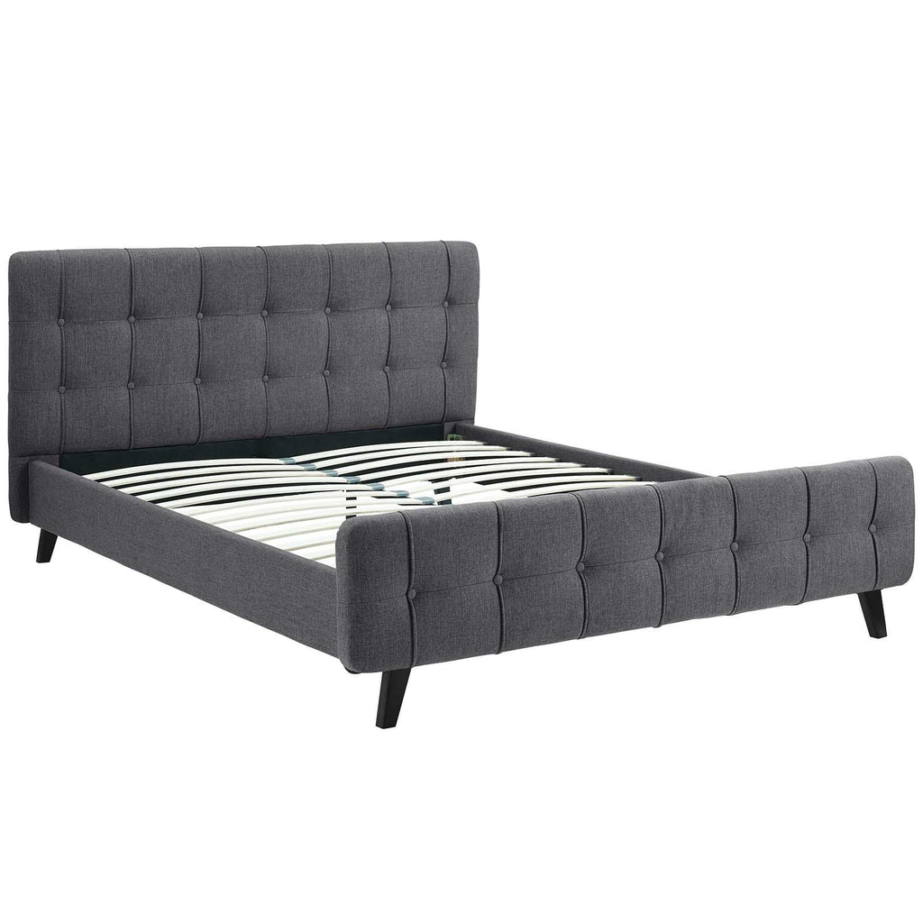 Restyle your bedroom d�cor with the Ophelia Platform Bed. Designed with luxury chic button tufted headboard and footboard, Ophelia comes upholstered in polyester featuring elegant trimming, black stained wood legs, and a slatted wood support system that eliminates the need for a box spring. Complete with a reinforced center beam with supporting legs for maximum stability, the Ophelia integrated bed frame accommodates the various mattress types on the market such as memory foam, spring, latex, and hybrid. A modern centerpiece to your bedroom, Ophelia is a quality modern bed poised to thoroughly transform your space. Weight capacity up to 1300 lbs. Mattress Not Included.