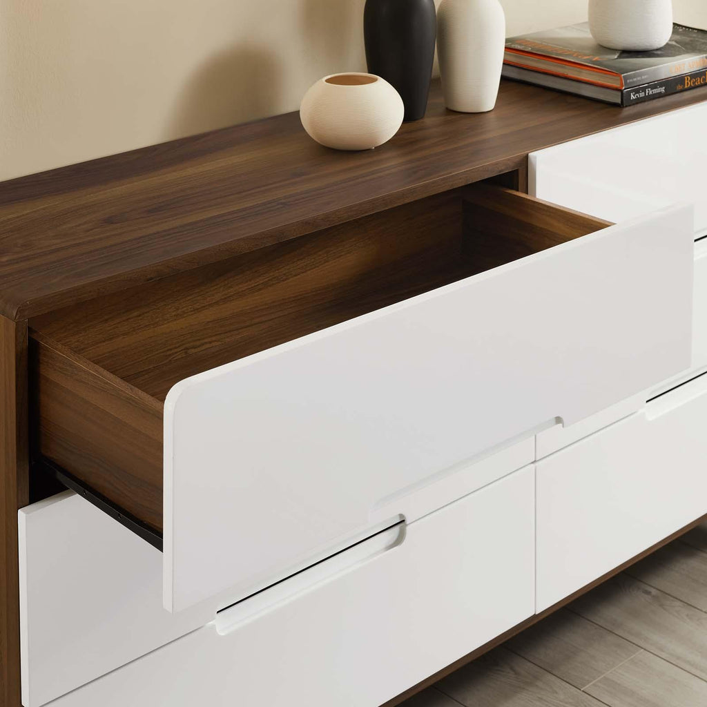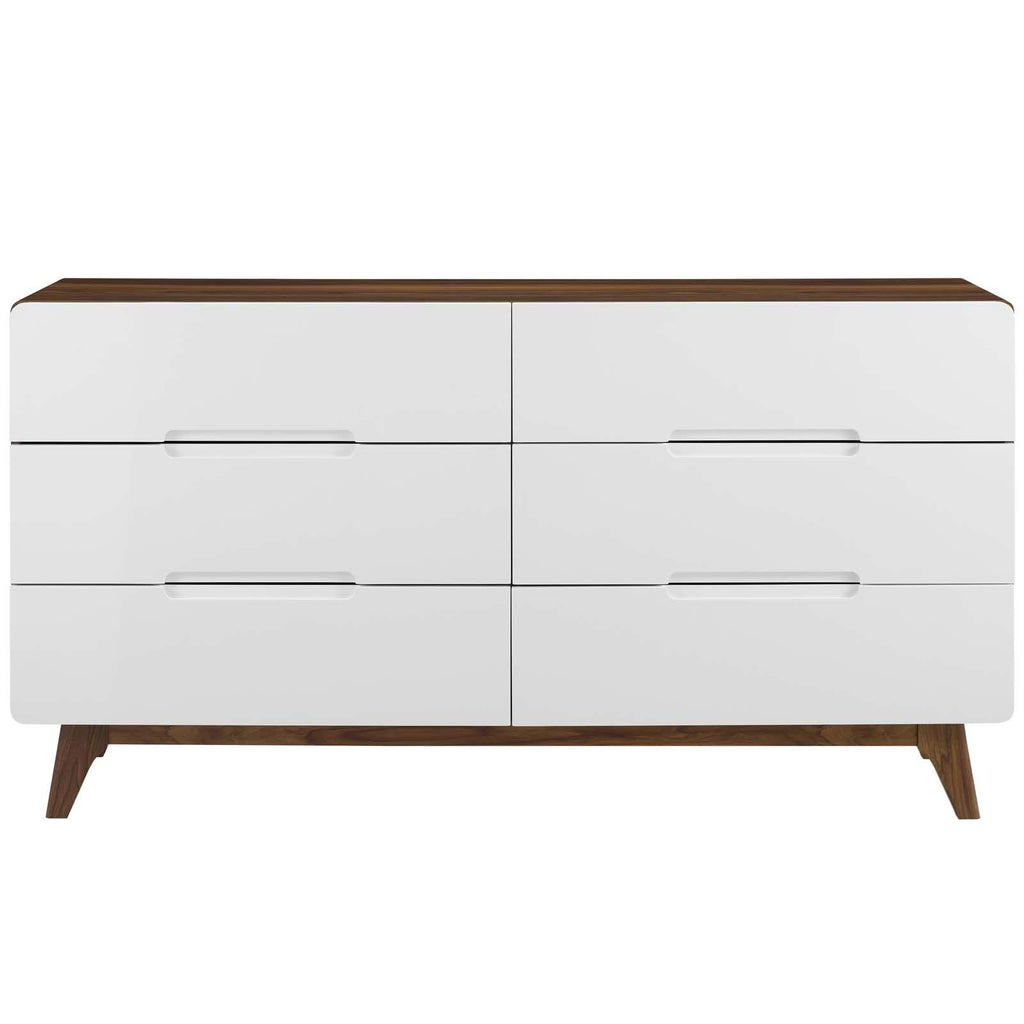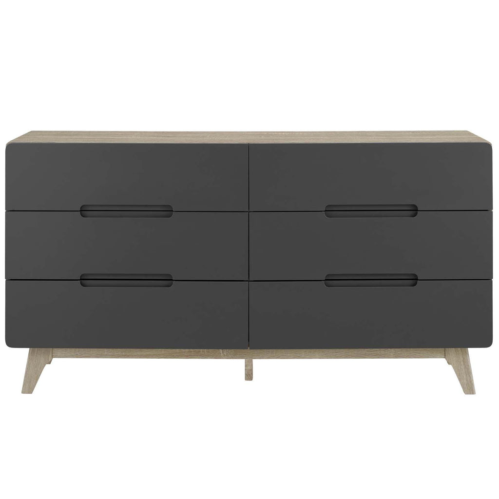 Bring the iconic energy of mid-century style to your bedroom, dining or living room with the Origin Six-Drawer Dresser or Display Stand. Crafted with durable fiberboard for reliable support, Origin comes with a splayed frame, rounded edges, linear design, wood grain laminate, and six full-extension drawers for concealed storage. The perfect complement to your bedroom, living or dining room, or entryway decor, display and store pictures, clothes, dishes, home accessories, and more with this contemporary modern dresser, stand.