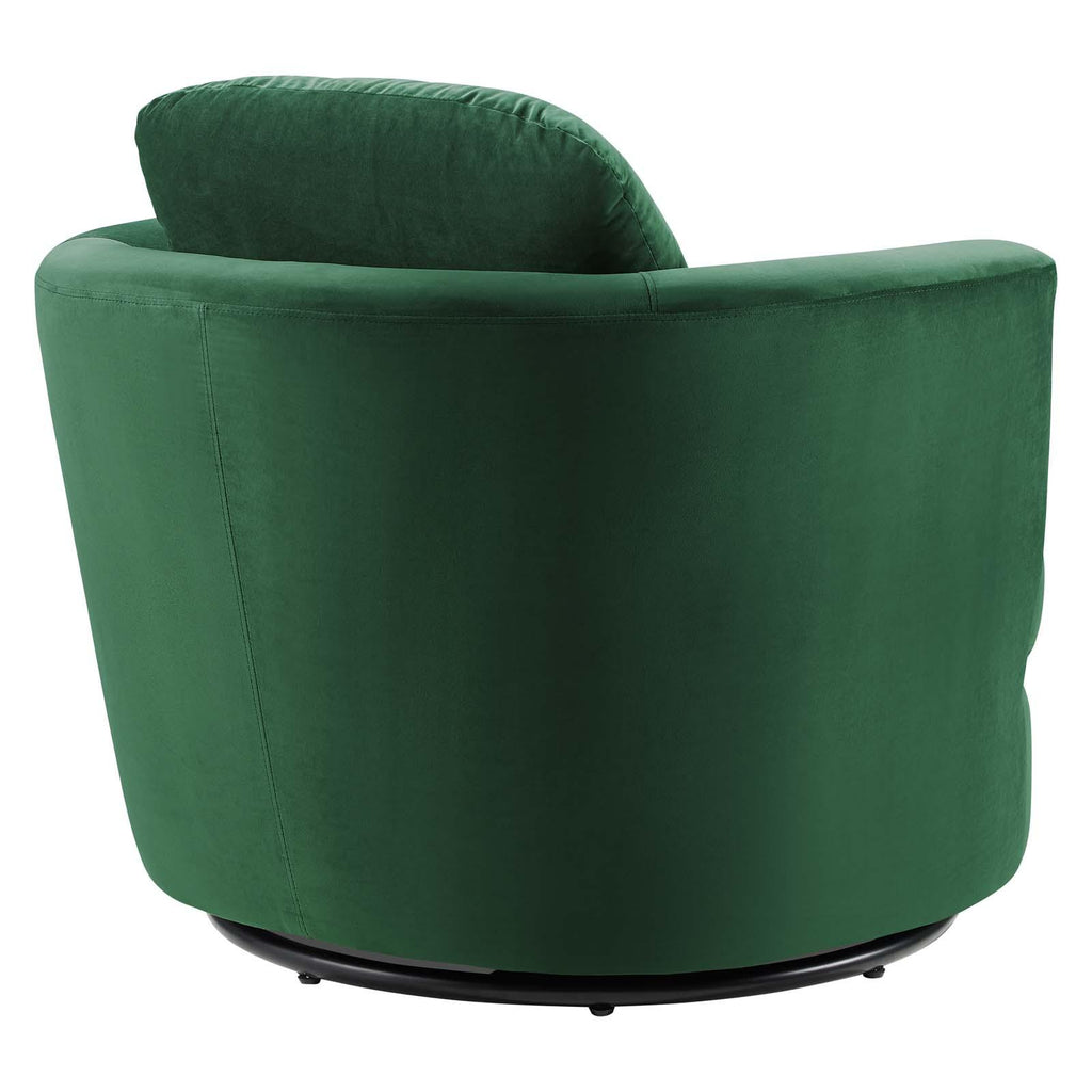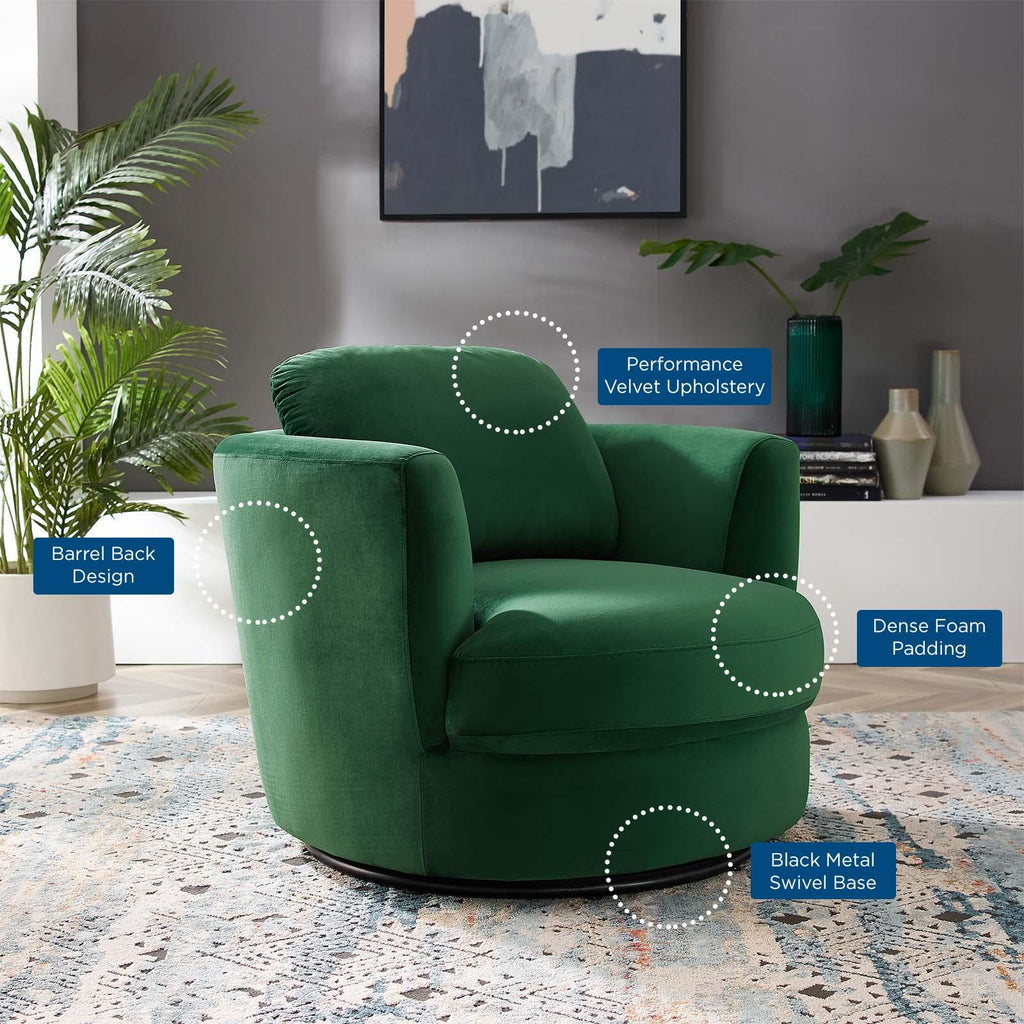 Spin around mesmerized by your surroundings in the Pirouette Performance Velvet Swivel Armchair. With a tailored profile and barrel back design, this velvet accent chair grants glam deco style and vintage modern elegance to your living room, bedroom, entryway, office, or other seating area. A premium seating experience, this upholstered armchair is covered in soft, stain-resistant performance velvet, padded in dense foam, and complete with a pocket spring support system. Swiveling to your position of choice, this barrel back chair sits atop a sturdy metal swivel base. Weight Capacity: 300 lbs.